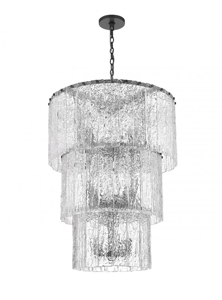 Three tiers of icy clear glass create depth and impressive artistry for this modern 12-light chandelier. Its durable steel frame receives a matte black finish, creating depth and contrast over a foyer or in your dining room. This chandelier is a true statement piece, offering refined sophistication and elegance.