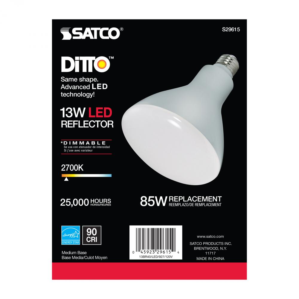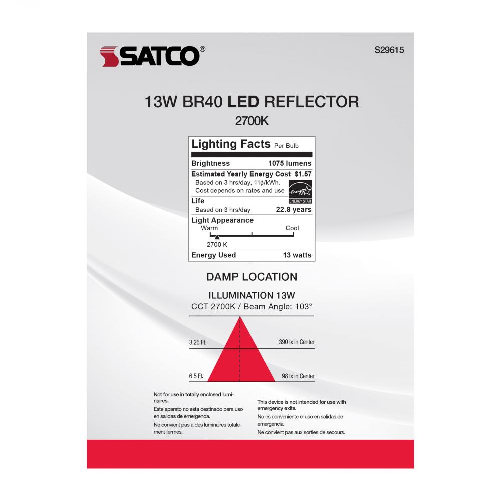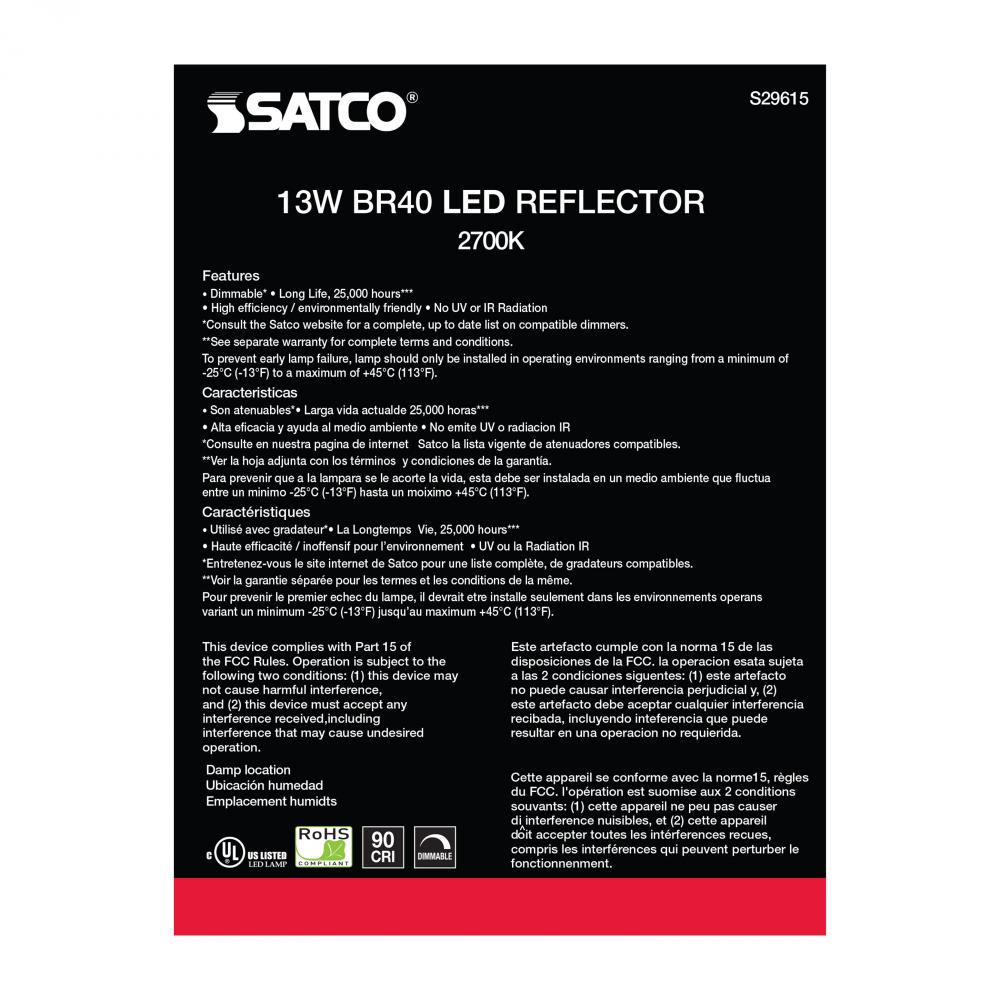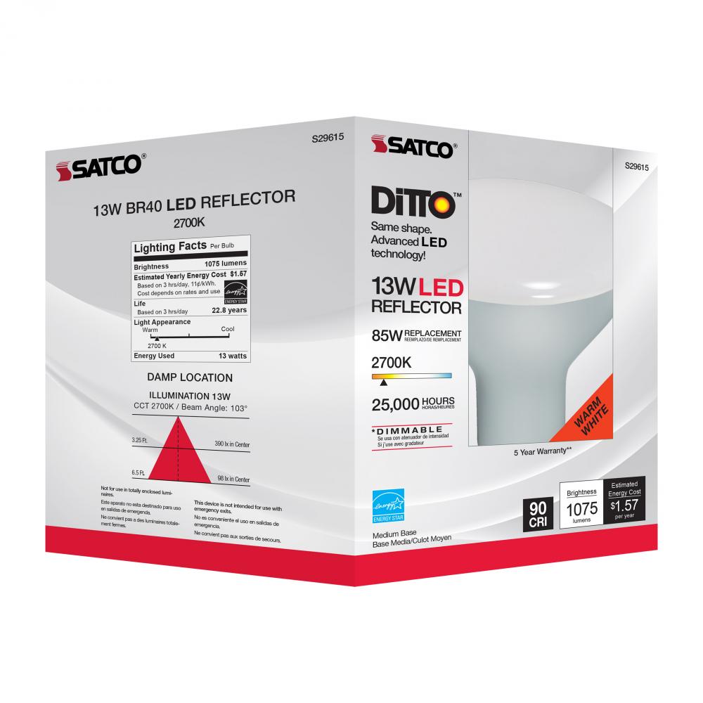 Satco's 13-watt BR40 LED lensed lamp offers warm white light and a 103 degree beam spread. This LED reflector is an energy efficient lighting solution for residential and commercial applications. Dimmable and long lasting, this frost finished bulb deli