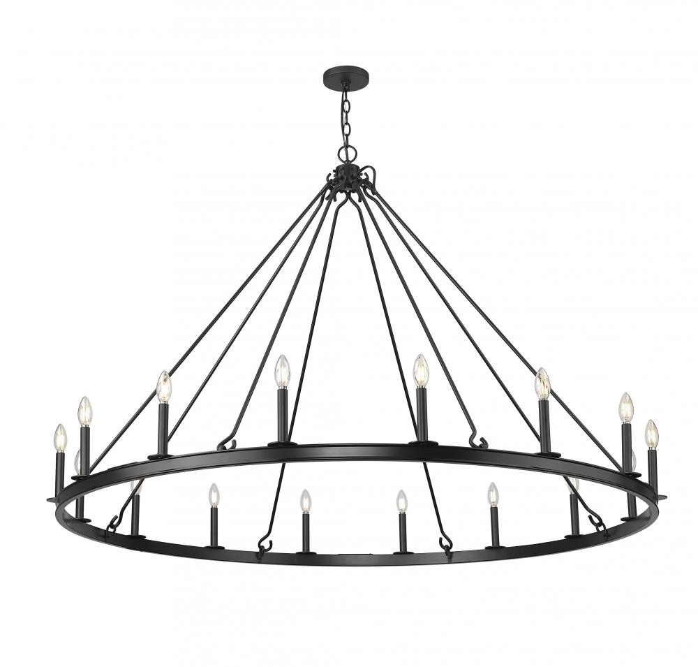 Clean and classic, this modern 16-light ring chandelier sets the tone over a grand foyer or dining room. It?s a simple steel frame with candelabra lights, creating a soft, inviting glow. A matte black finish completes the look and creates striking contrast and depth.