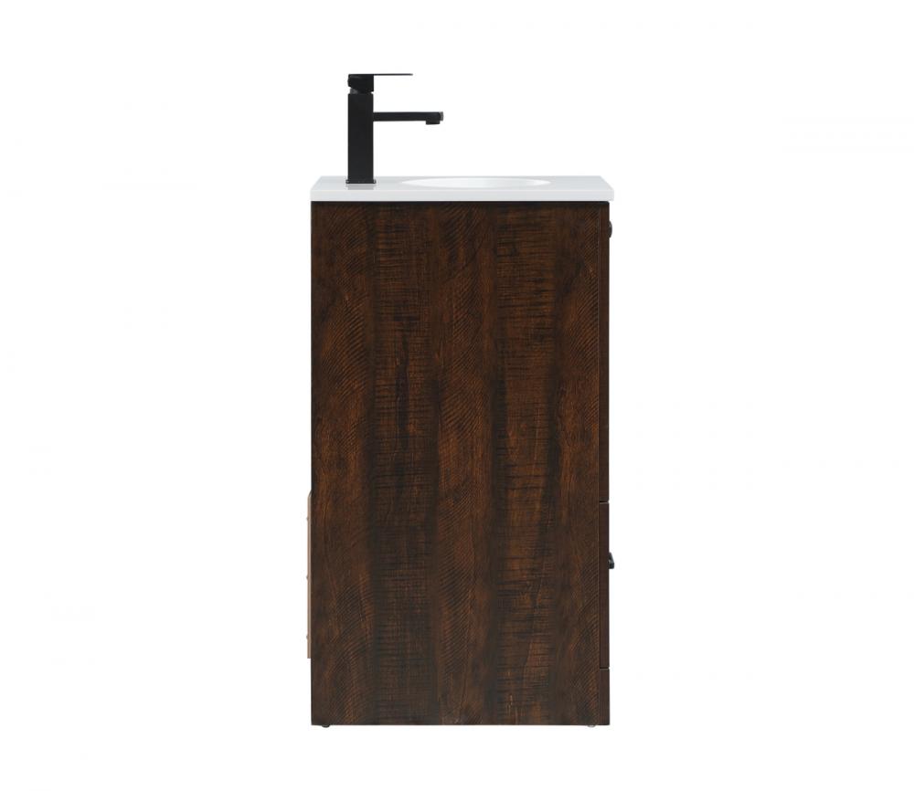 Delve into a world of minimalistic fashion and contemporary styling with this farmhouse 18" vanity. The clean faux lines anchors the weathered design. Black handle adorns the door hiding the base of the integrated porcelain sink while the bottom drawer allows you to store your bathroom necessities and toiletries. The compact size makes it the perfect vanity for any bathroom or powder room, regardless of size.