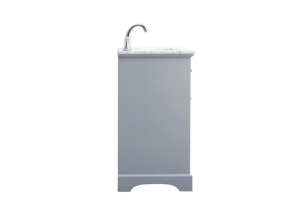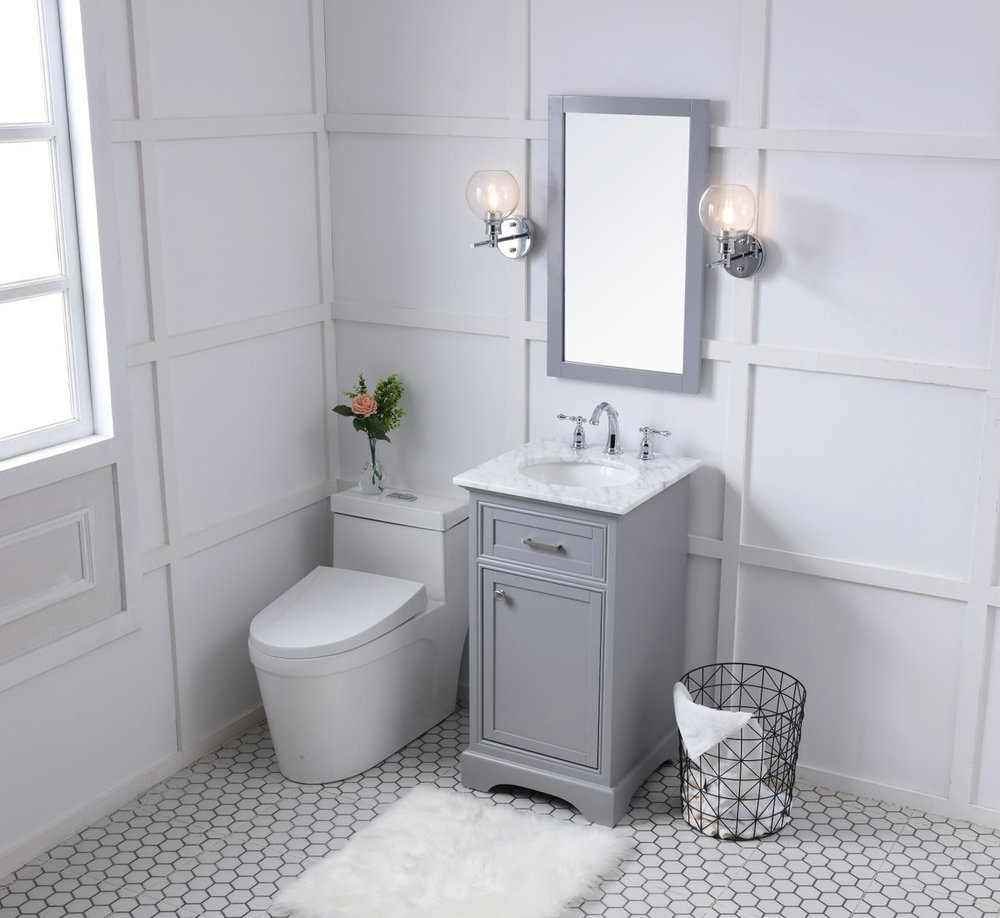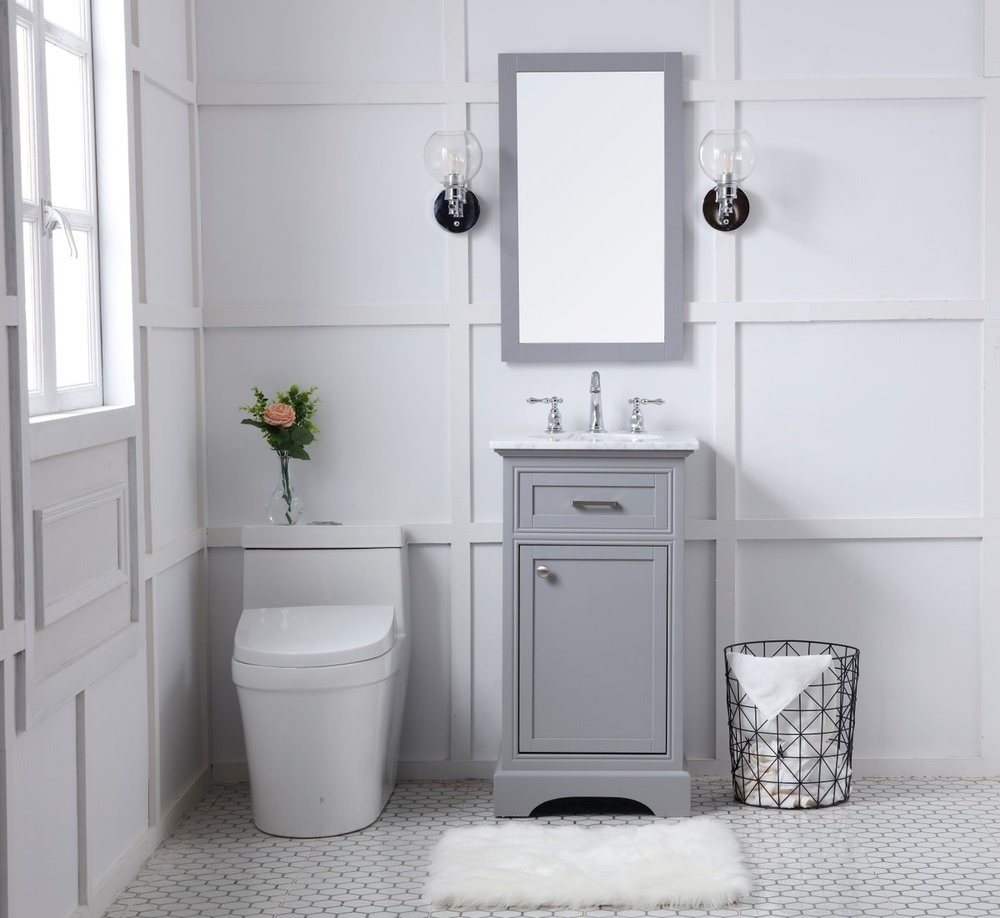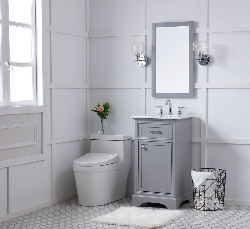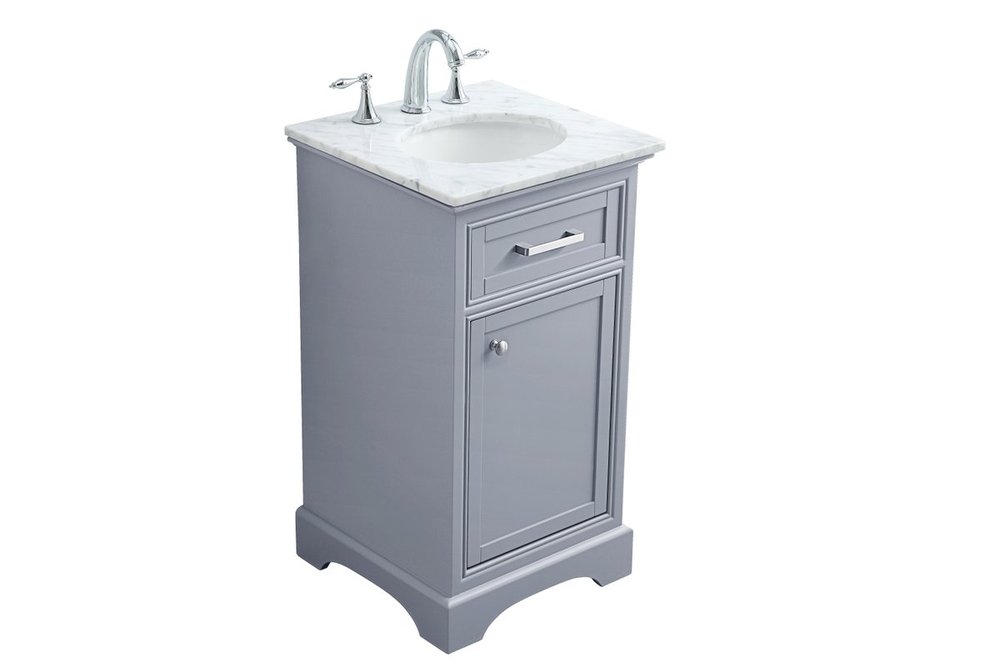 From its Italian Carrara white marble top to its contemporary-styled hand painted Soft grey cabinet, it is sure to enhance either your home or office bathroom. Beneath its lustrous, natural marble top and oval, white porcelain under-mount sink, a handsome Single door cabinet with a shelf inside for all your bathroom essentials, highlighted with recessed panel doors, brushed steel bar handle and knobs, stands on a strong solid base . A wonderful balance of simplicity and practical function! Measurements: W19”xD19”xH35”