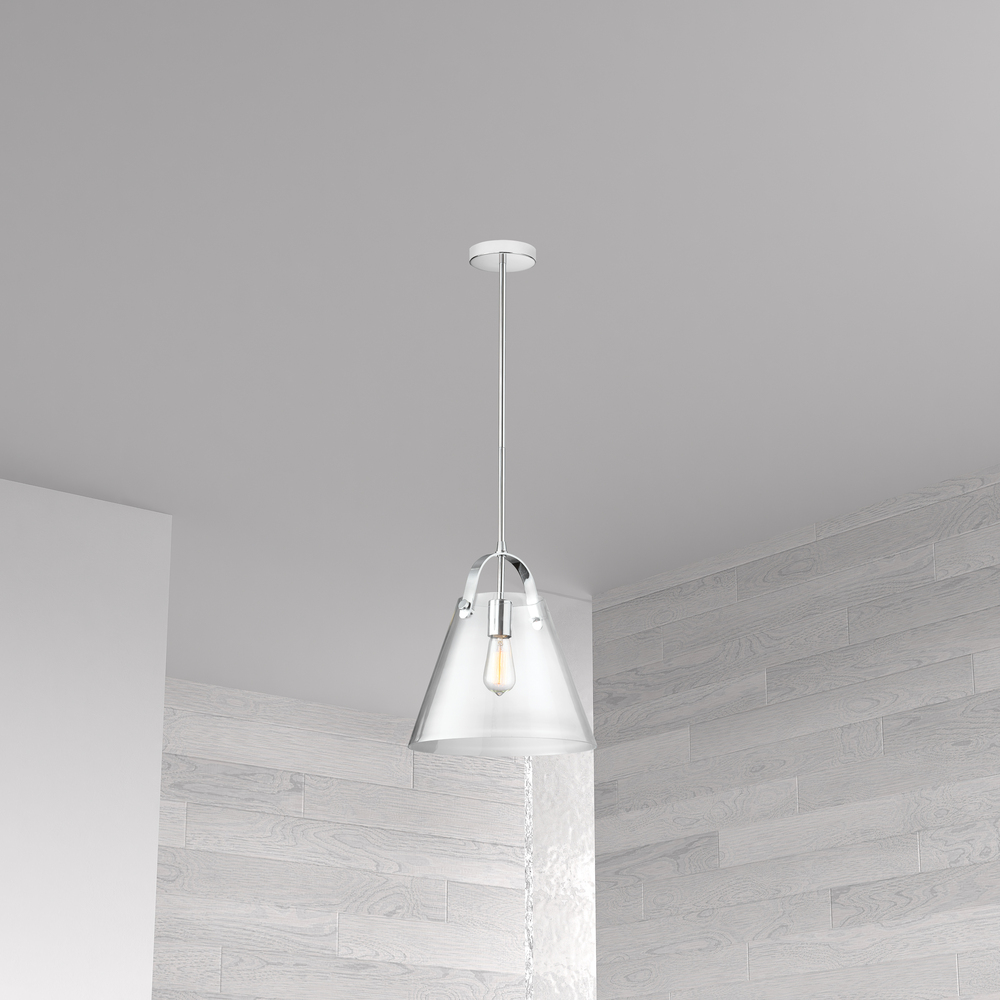 The Polly family of lighting acts like a spotlight that will draw attention to the furnishings in its vicinity. It features an intriguing design with a modern sheen. The metal frame in your choice of finish drops straight into a glass housing with a tapered drum shape. A metal arm curves upwards towards the drop to complete a triangular outline. Along with the metal finish, different bulb shapes create multiple looks. The unusual profile and gleaming surfaces make it a stylish addition to foyers, kitchens and dining rooms.