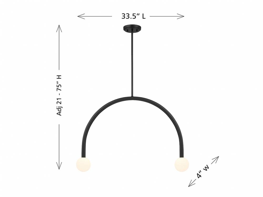 This perky, peppy 2-light chandelier has a curving style that makes a big impact! The light shines from inside orbs of white opal glass and the Matte Black finish works beautifully with any decor. This chandelier is 33.5" in length, 4" in width and has an adjustable height ranging from 21" to 75". It comes with four 12" downrods and one 6" downrod. Uses two G9 LED bulbs of up to 3.5 watts per bulb. Bulbs not included.