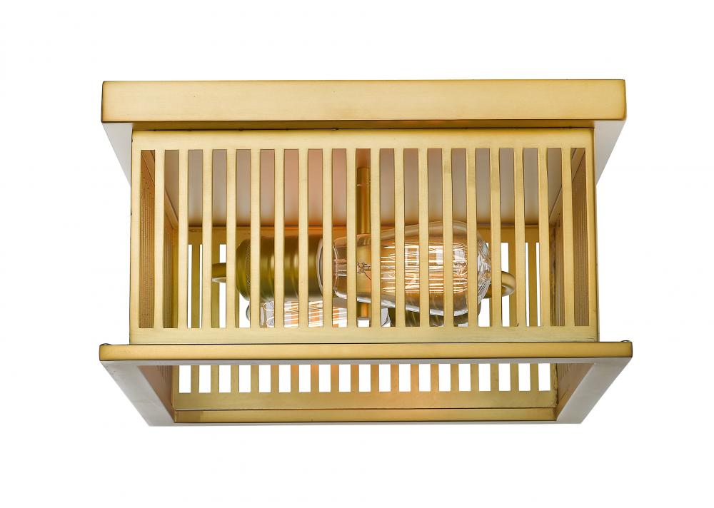 Sleek and stylish urban industrial attitude radiates from this two-light flush mount ceiling light. Offering rich, warm character, its brass finish steel frame adds an enticing accent to any contemporary space.