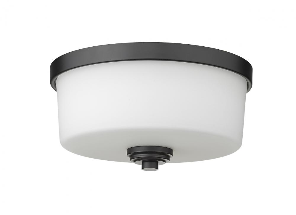 Bathe your surroundings in the graceful illumination that radiates from this two-light flush mount ceiling fixture. Stylishly simple, it boasts a round, matte black frame that creates a striking contrast with its delicate, matte opal shade. This transitional ceiling light is especially ideal for a bedroom, hallway, kitchen, or living room.