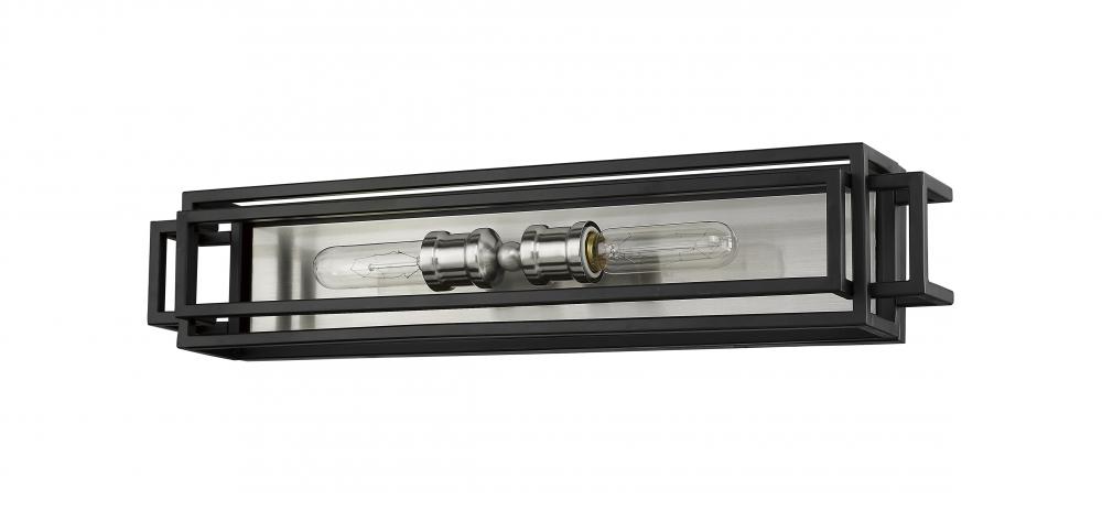Exquisitely crafted with bold, black lines surrounding a gleaming, brushed nickel frame, this two-light vanity will illuminate your home in style. This handsome fixture looks especially elegant when placed over a bathroom mirror.