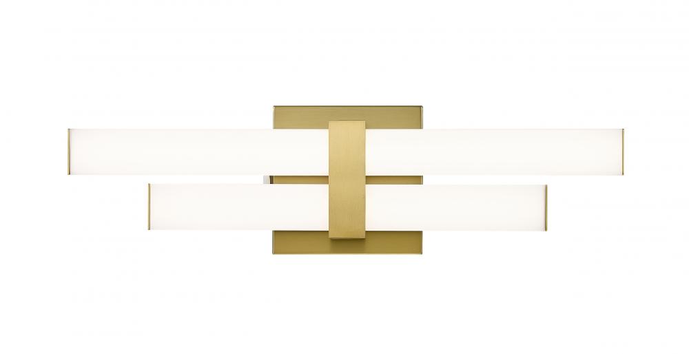 Linear and modern, this crisp contemporary two-light vanity stresses a structural flavor that illuminates custom bath spaces. Aluminum framing and accents offer a chic modern gold finish, as graduated frosted bar diffusers align vertically to emit dimmable LED lighting with a customized option of white color values.
