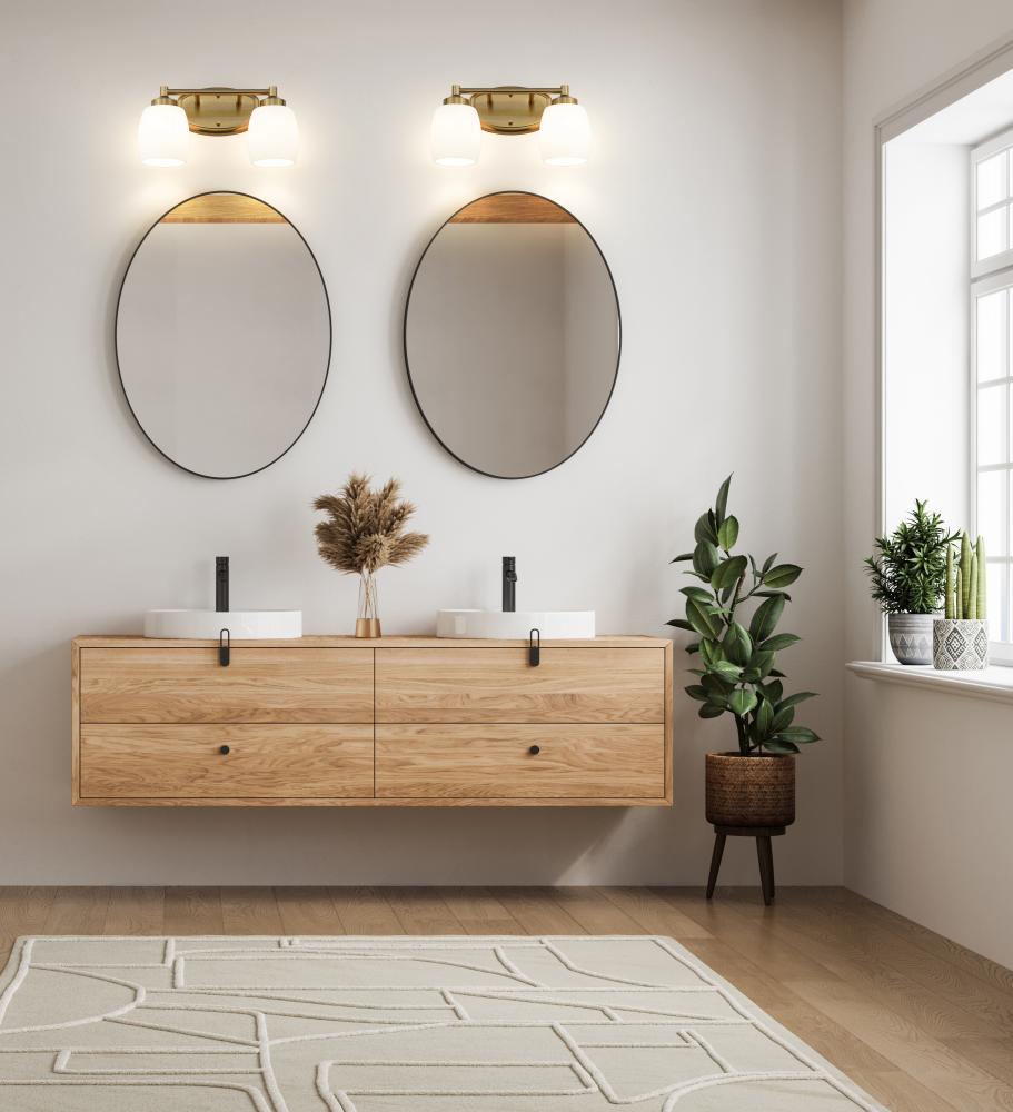 Deep luxe gold adds fresh sophistication to the compelling curves featured in this modern two-light vanity fixture. A straight arm decorates a rounded wall plate, while rounded shades in matte opal glass create soft illumination. Its the perfect choice over a bathroom vanity in need of an update.