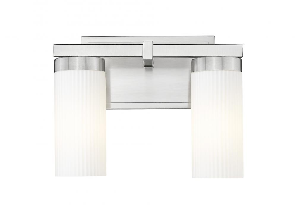 Coming in hot with a brushed nickel finish and twin ribbed glass shades, this two-light vanity delivers structure, balance, and understated charm. The rectangular backplate ties the look together with crisp lines and a tailored feel. Designed to brighten with purpose, it brings effortless refinement to any setting.