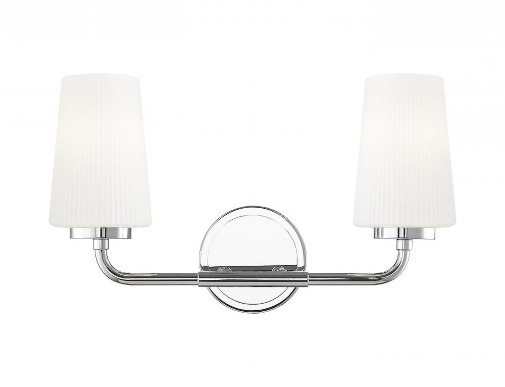 Ribbed opal glass creates the perfect hint of texture and depth for a modern two-light vanity sconce thats perfect for primary and guest baths. In gleaming chrome, it shines with stylish appeal, delivering simplicity with a round wall plate and extended U-shaped arm. Add one over a mirror or a pair on either side to create the right lighting for your space.