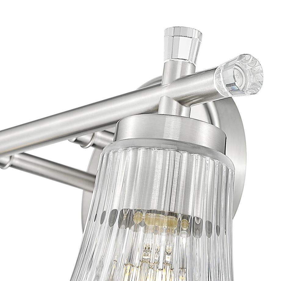 Delivering the dramatic, a brushed nickel finish brings modern balance to this two-light vanity fixture?s delicately fluted design. Clear glass shades shimmer like crystal, offering light that?s both functional and fanciful. It?s a refreshing take on vanity lighting with an unmistakably elegant touch.