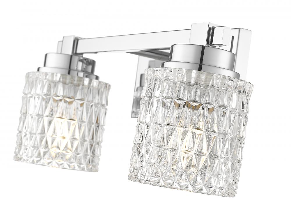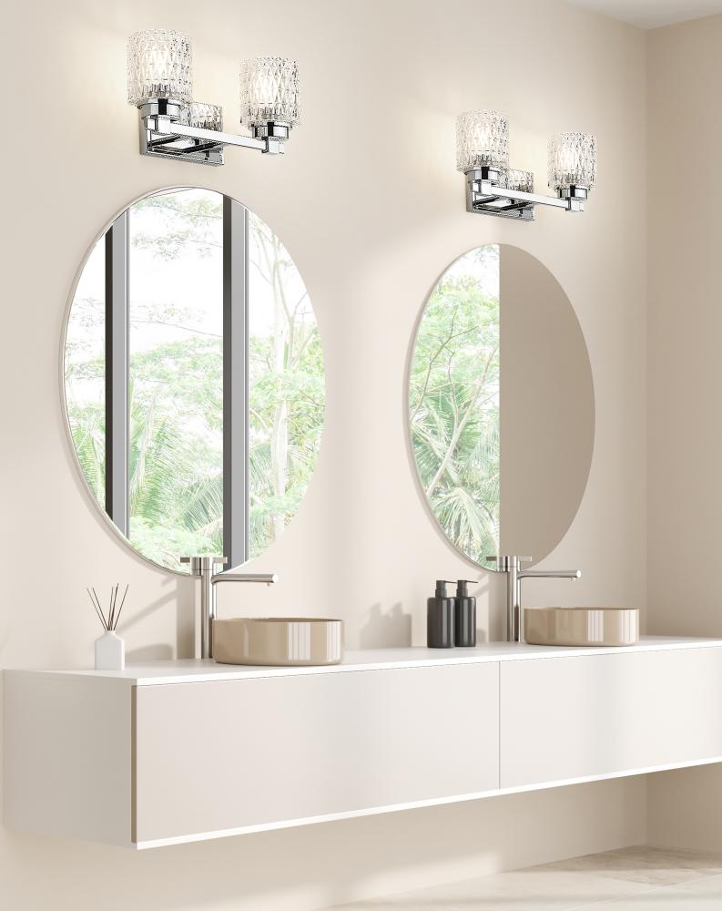 Glam comes in different forms, and this two-light vanity light brings it in tasteful measure to upscale bath spaces and open living areas. With the precision-cut diamond patterning on crystal-like clear glass shades, its shiny chrome finish steel frame is not to be missed. Enjoy alternate lighting to create mood illumination thanks to dimming functionality.