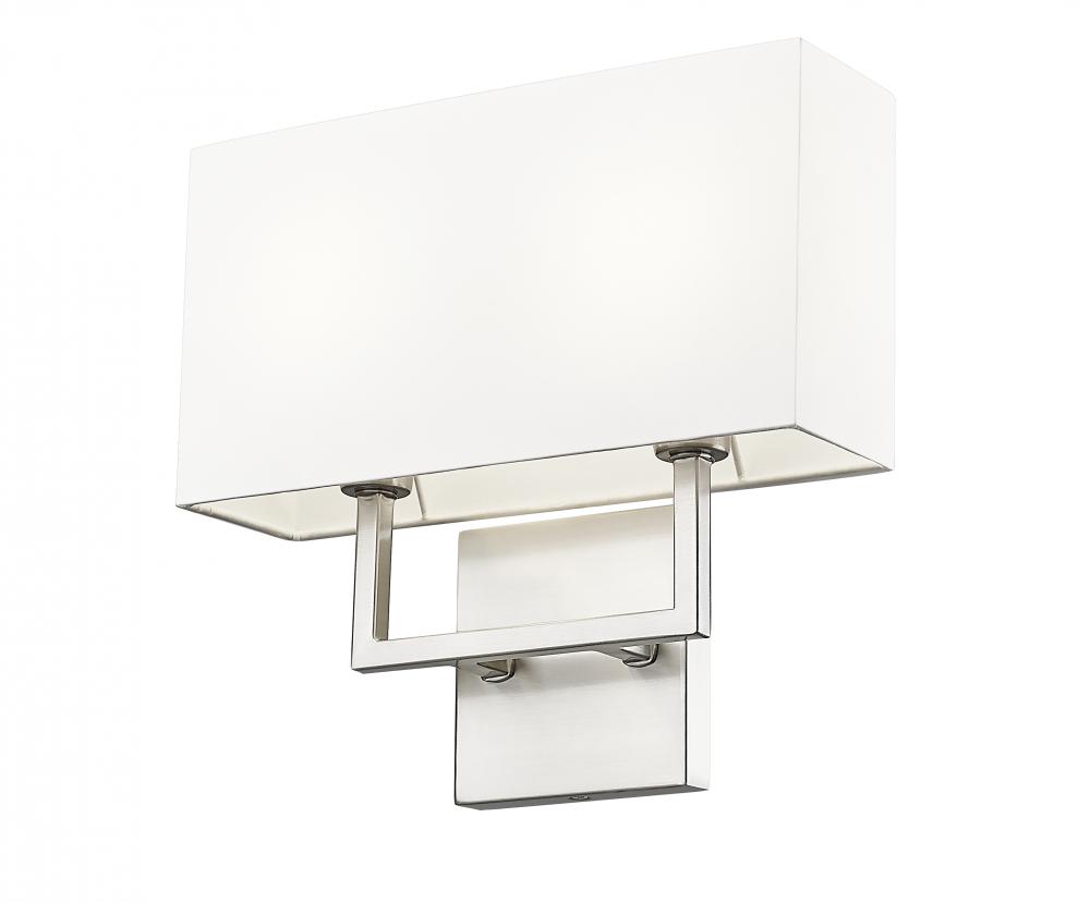 A low profile and structured arm design create a fresh, modern style for this contemporary two-light wall sconce. In a brushed nickel finish over steel construction, it boasts a square wall plate and white half-shade, offering a perfect complement to your hall or living room.