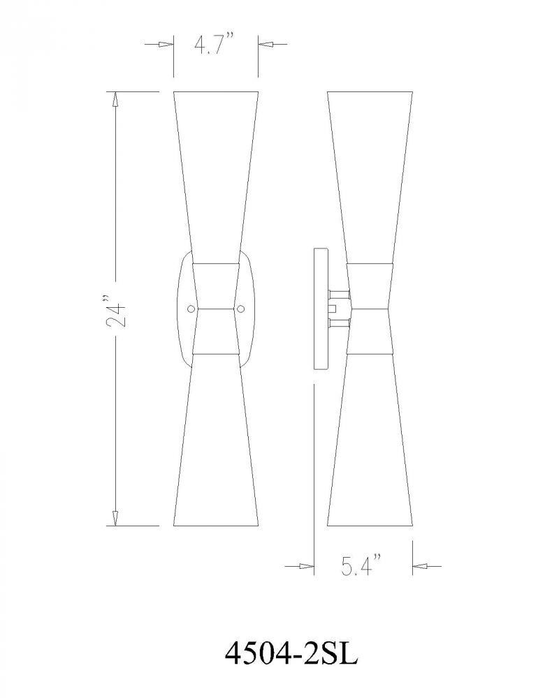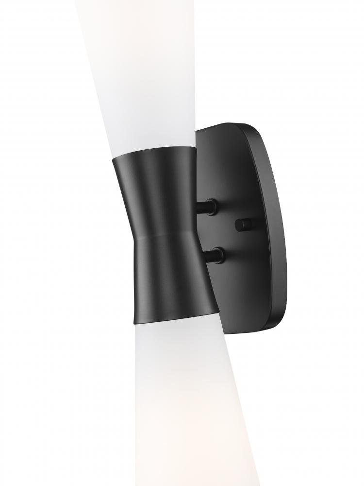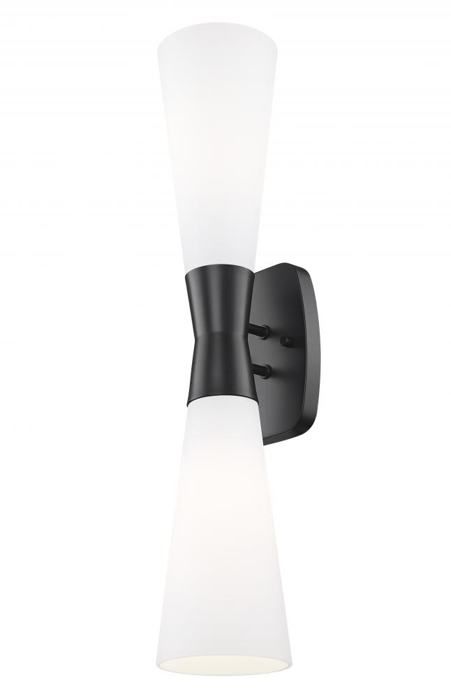 An attractive vertical orientation delivers an hourglass silhouette in a two-light wall sconce with a superb contrasting palette. Urban and deco motifs blend in a fixture crafted with matte black steel framing, including a chic cinched center holder. Tall matte opal glass tapered shades invert to distribute dimmable lighting evenly.