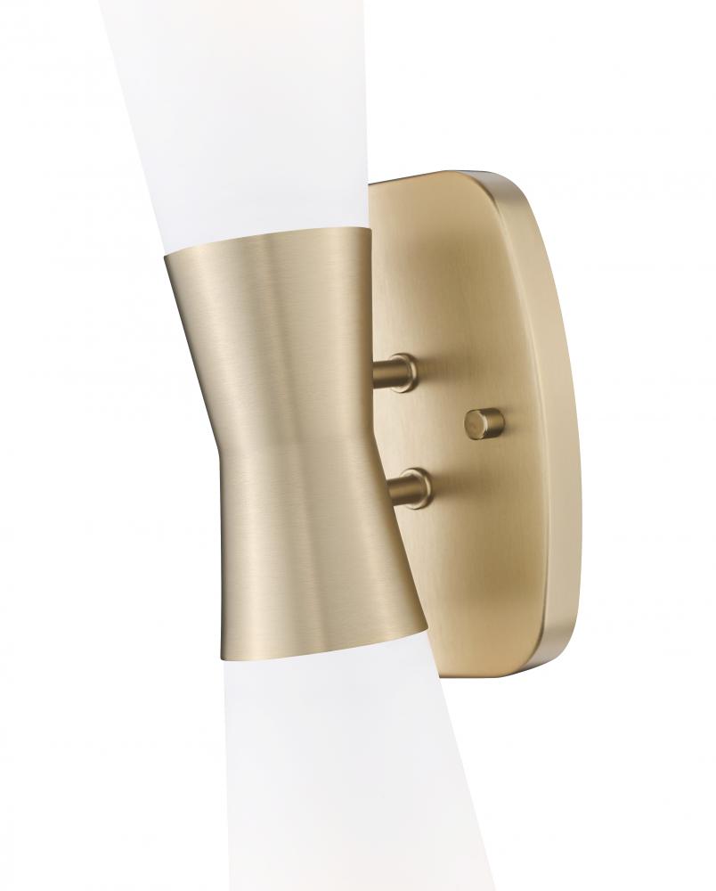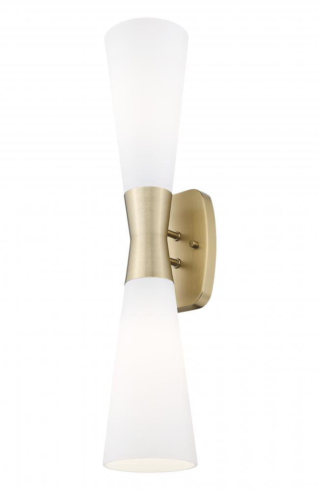 Lush modern gold finish steel becomes a focal point in a shapely hourglass-style frame, turning this two-light wall sconce into an elegant way to illuminate any setting. Explore the deco motif of a minimalist fixture adding a more measured hint of glam in dining spaces, entryways, bedrooms, and hallways. A pair of inverted matte opal glass tapered shades create a look of artisan sophistication, with dimmable lighting expanding the function of a tasteful sconce.