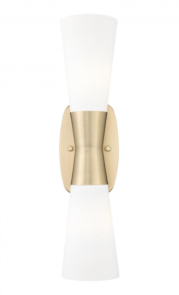 A mix of design motifs brings elegance and versatility to a two-light wall sconce youll love. Start with inverted, vertically placed matte opal glass contoured shades, chic and delicate. Continue to a beautiful modern gold finish metal frame configuration forming an hourglass silhouette.