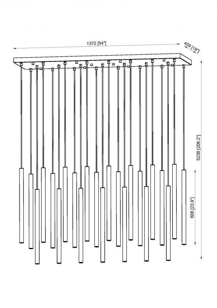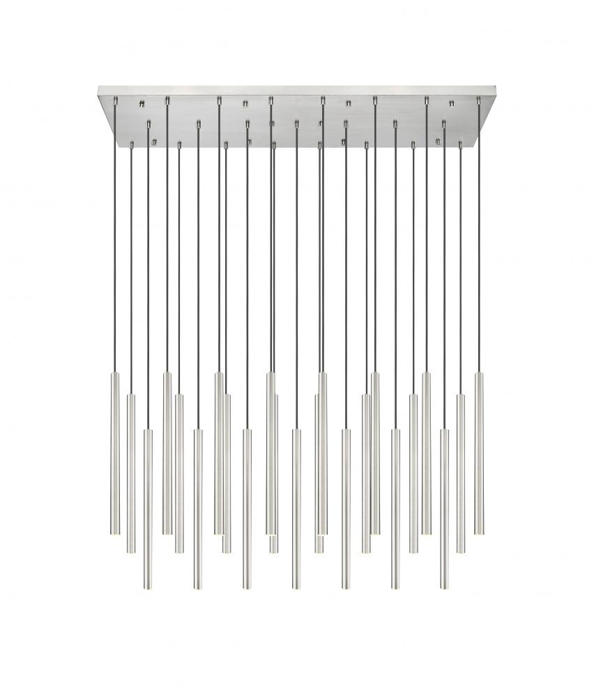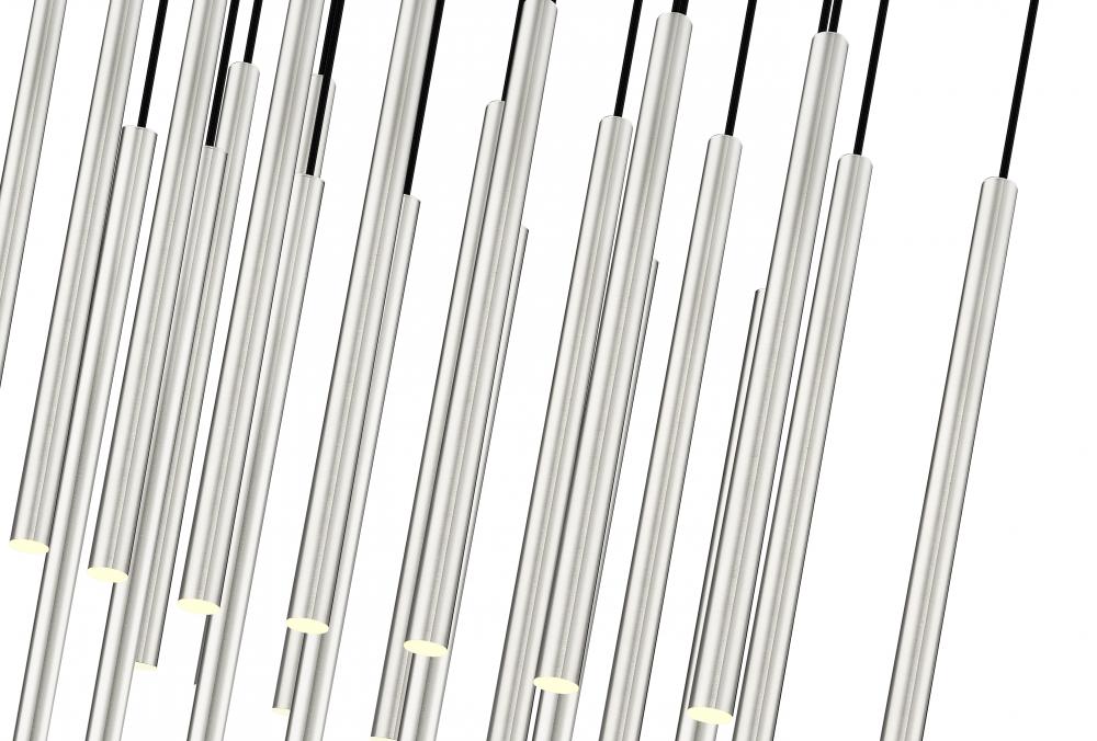 Generous size and a sleek brushed nickel finish are a compelling combination on this modern 23-light LED chandelier. Its linear silhouette creates bright, bold lighting, perfect for a dining room or foyer. The fixture features braided black cording that suspends slim light housings, offering pinpoint precision over your space.