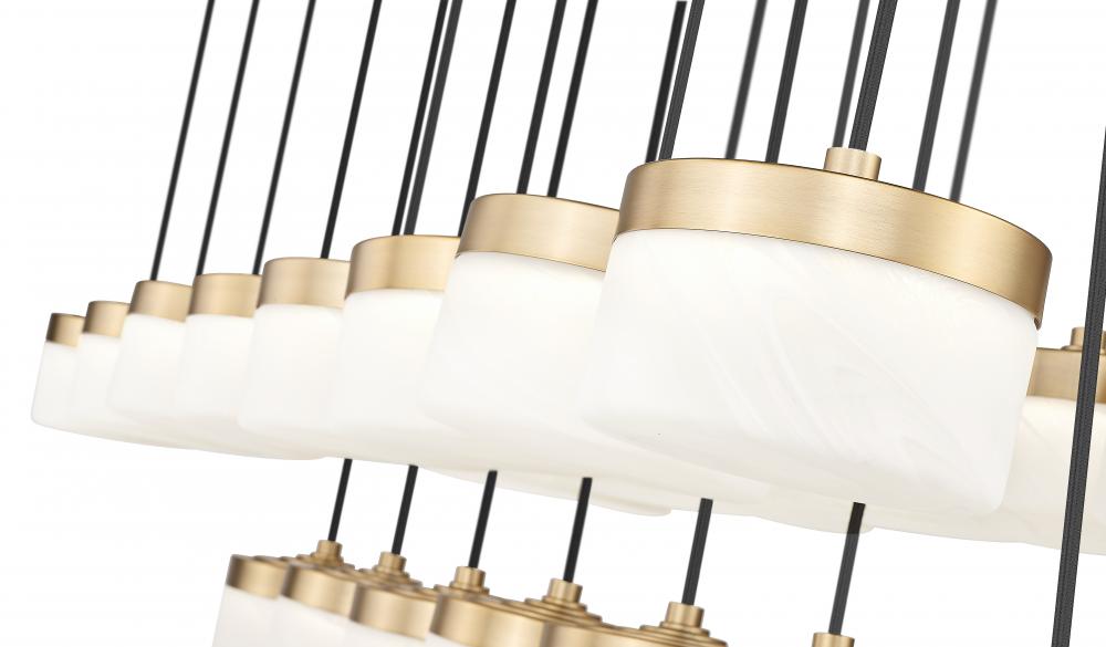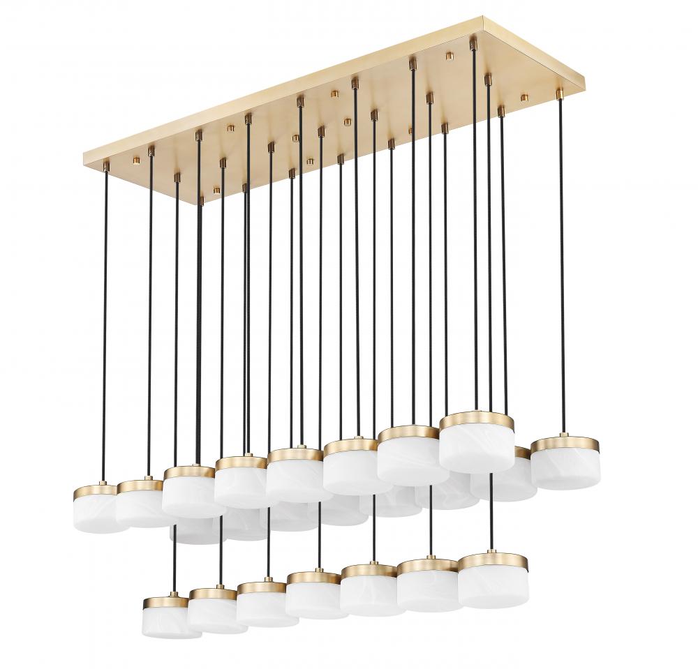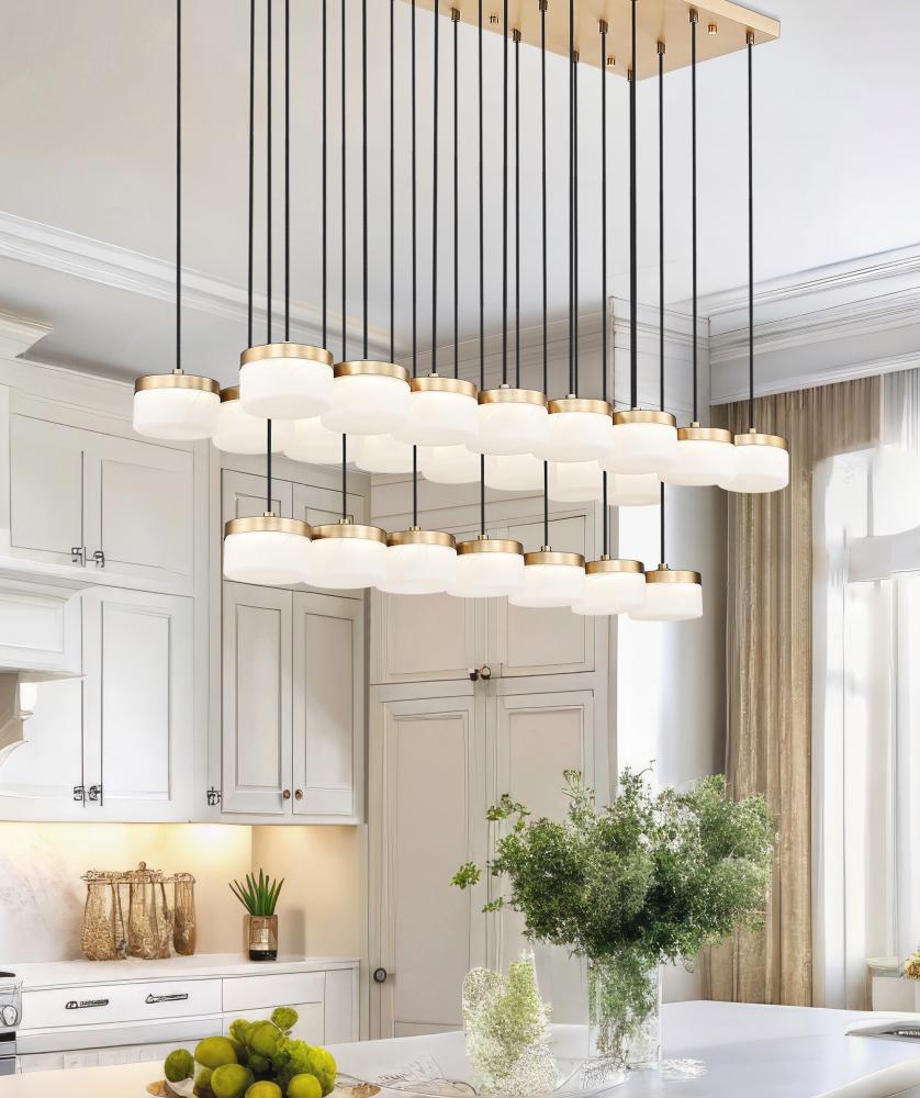 For expansive interiors that deserve a statement, this modern gold 23-light linear LED chandelier stretches out in a brilliant row of frosted disks that visually anchor the room. The warm metallic finish catches daylight by morning and candlelike reflections by night, while the clouded glass keeps the light comfortable for long, late-night conversations. Hung over a long farmhouse table or a broad kitchen island, it pulls the seating area together, so family and friends naturally gather beneath it.