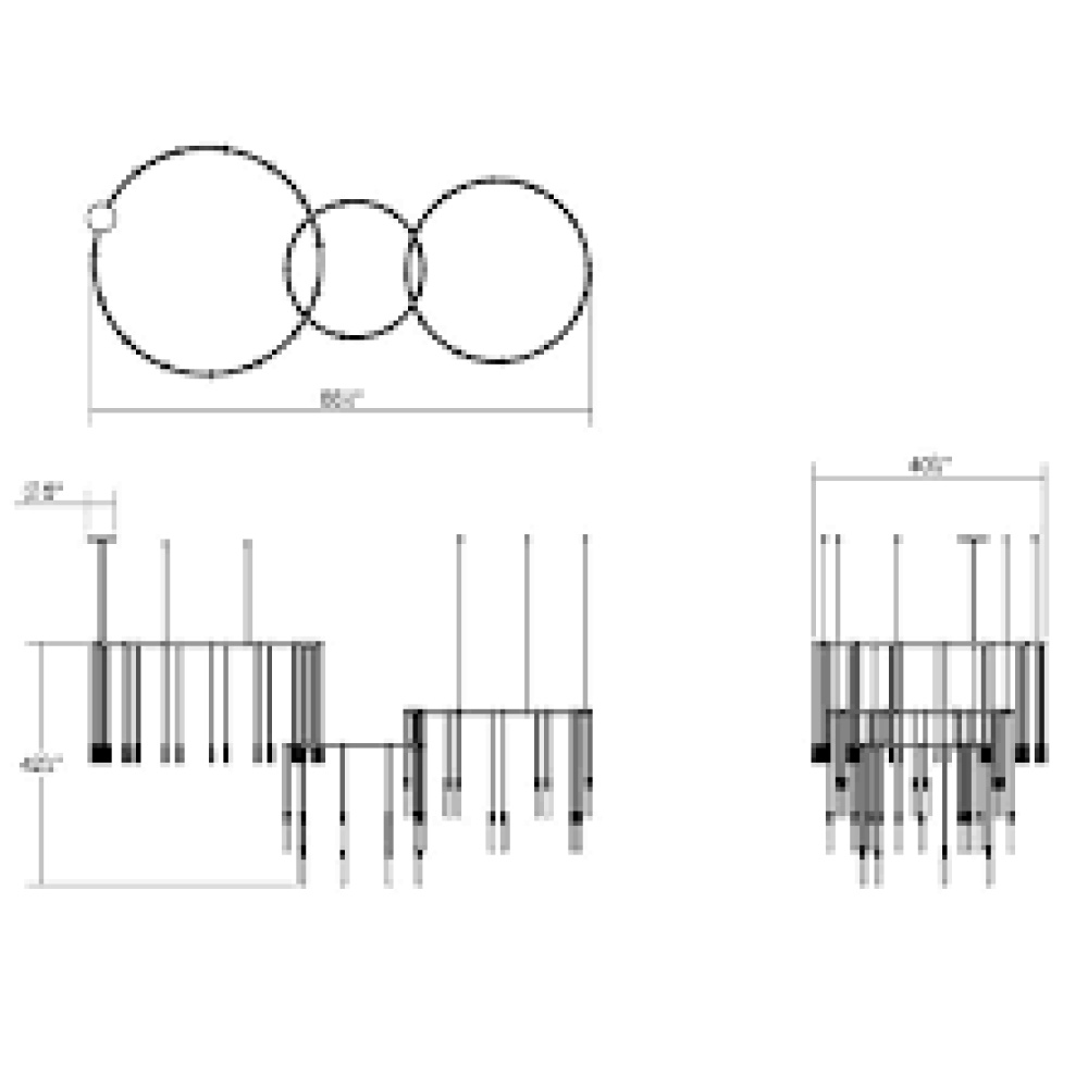 Shown here are multiple three-ring configurations of Offset Rings with Suspenders Rod Luminaires in etched glass. Rod Luminaires are also available in clear ribbed seeded crystal. Available in two sizes, this three-ring composition can be assembled into a limitless variety of positions and combinations.