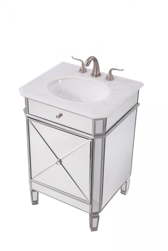 Beautiful vanity with an authentic carerra white marble top. The door is decorated in crisscrossed mirror panels in a hand-rubbed in silver finish. Decorated with brushed steel knobs and ring pull, this vanity will add a clean, sharp contemporary look and destine to please. Vanity ships ready to install.
