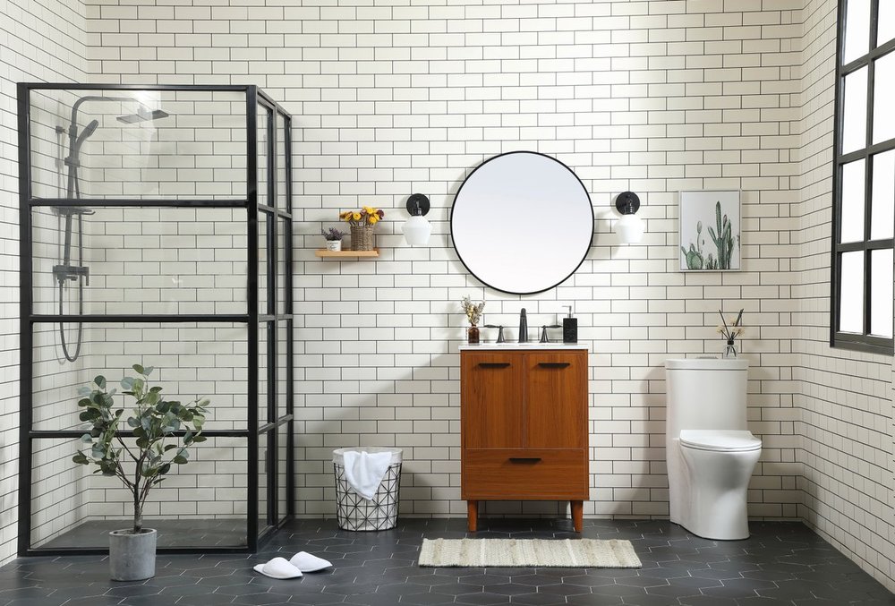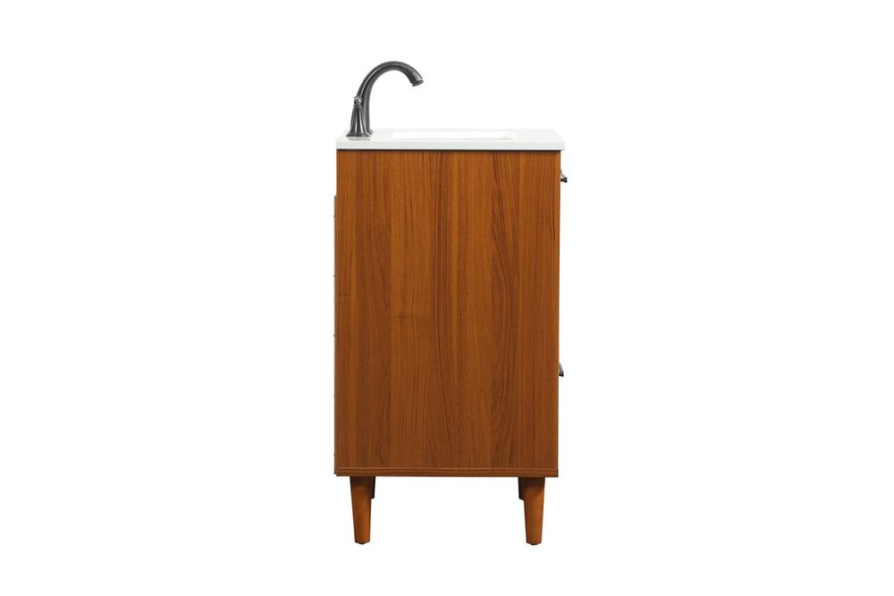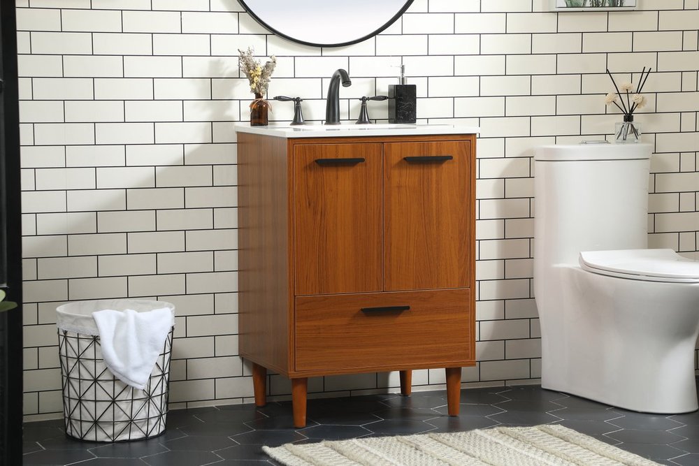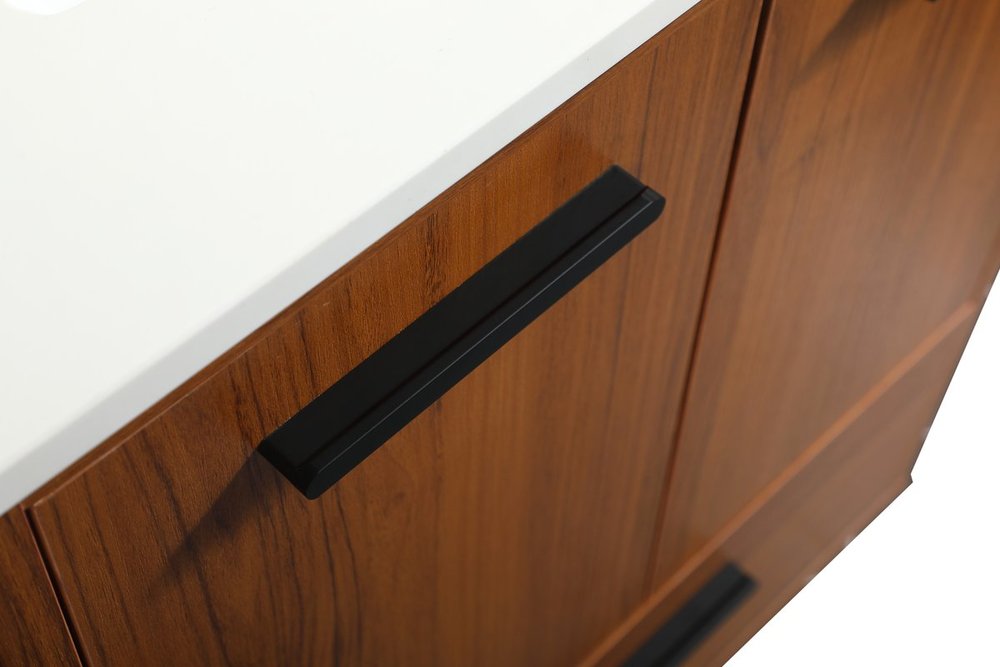 Modern sophistication is defined with the teak finish and black barpulls of this vanity and slender tapered legs. Its length makes it the perfect addition to any sized home, and saves space with its storage area hidden behind the double cabinet doors and one bottom drawer. Topped with a highly durable engineered stone countertop and a porcelain undermount sink, this modern design will become your focal point of your bathroom or powder room. Equipped with soft-closing drawer and doors adds a quiet functional touch.