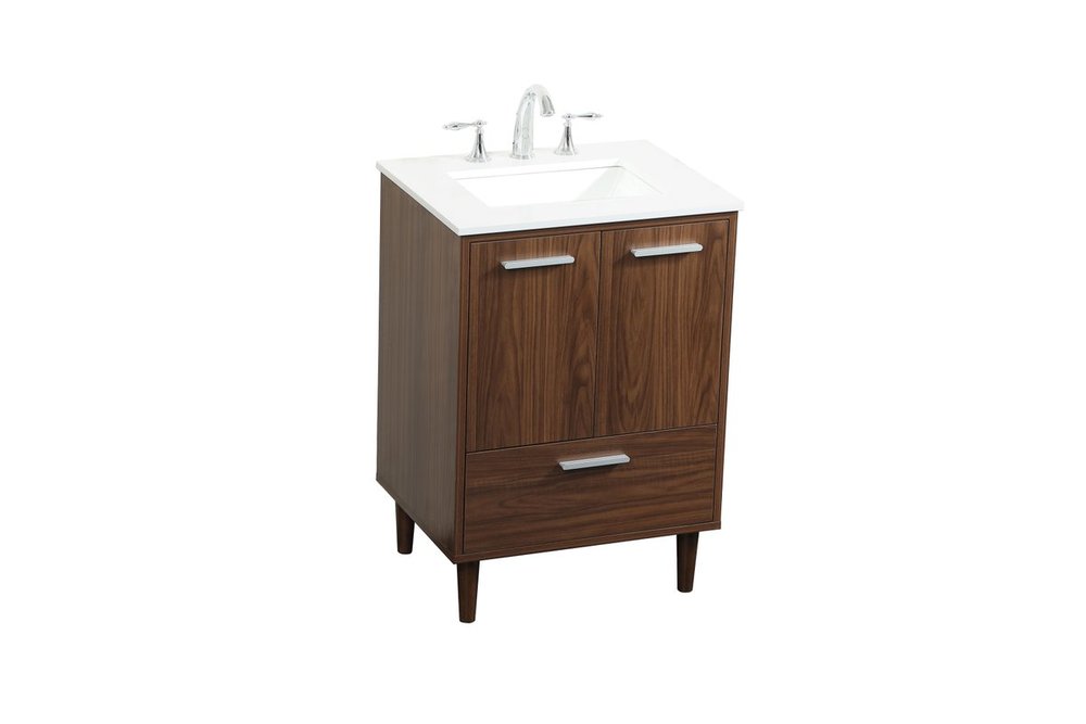 Modern sophistication is defined with the walnut finish and silver barpulls of this vanity and slender tapered legs. Its length makes it the perfect addition to any sized home, and saves space with its storage area hidden behind the double cabinet doors and one bottom drawer. Topped with a highly durable engineered stone countertop and a porcelain undermount sink, this modern design will become your focal point of your bathroom or powder room. Equipped with soft-closing drawer and doors adds a quiet functional touch.