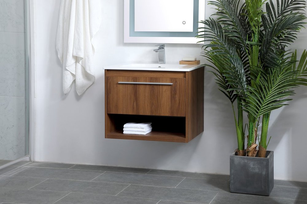 Save space and make your bathroom appear bigger with this 24" floating vanity in a walnut brown finish. Its minimal design will have you in awe, while its clean lines will leave your room feeling fresh and uncluttered. The Single u-drawer pulls out for storage while the open space below allows you to place extra towels or various other essentials.
