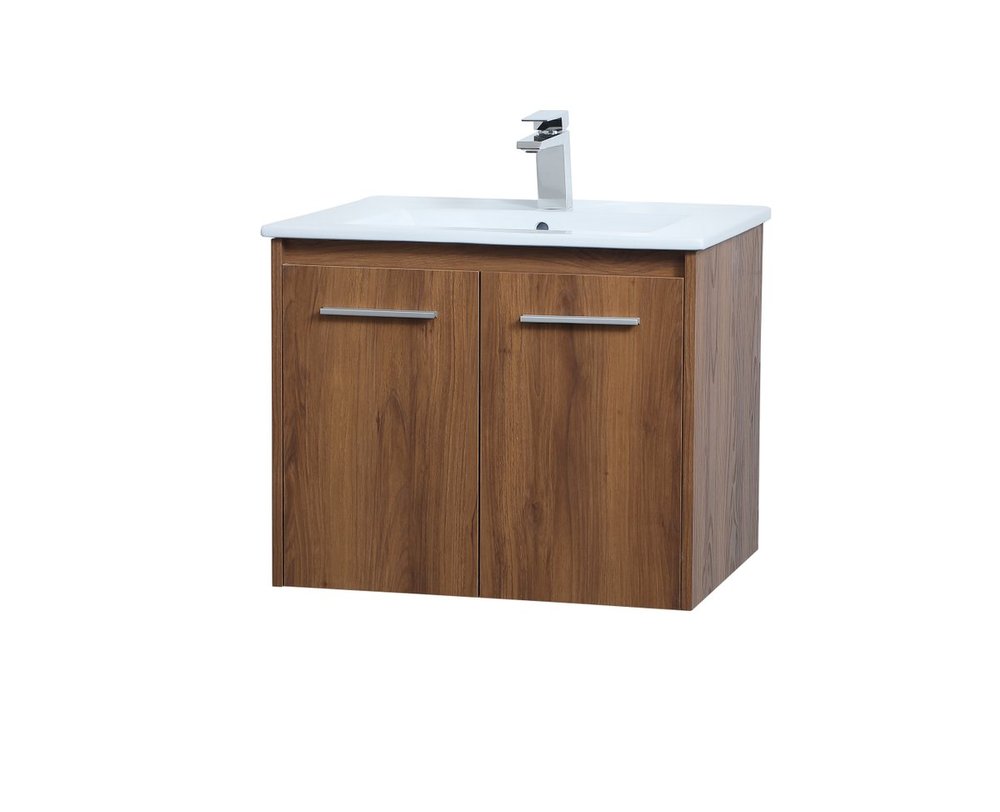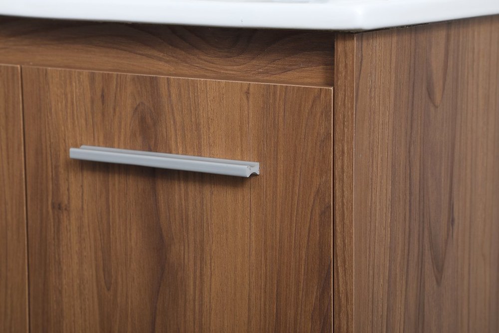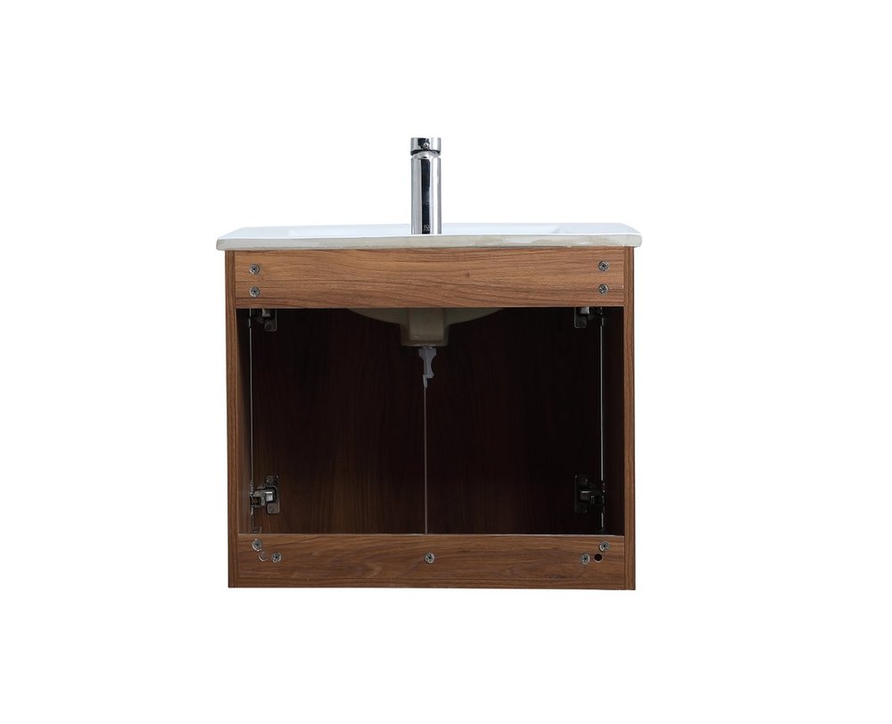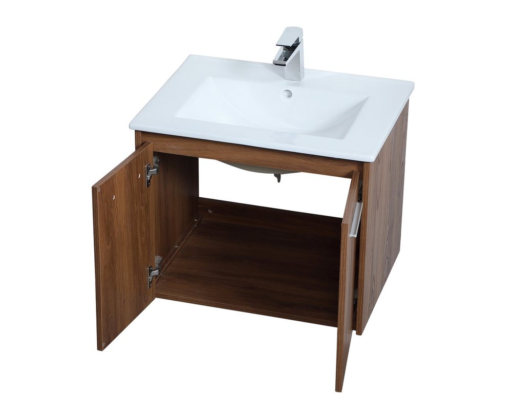 The contemporary simplicity of this 24" floating vanity in a walnut brown finish will help open the space and add stunning modern flair to your bathroom or powder room. The open space below makes it easy to show off your tiles and to clean the floor with ease--it's also the perfect place for a hamper. Double doors open to reveal plentiful of storage pace to store all of your bathroom miscellany. The clean lines that permeate through the design will surely create a fresh look in your home.
