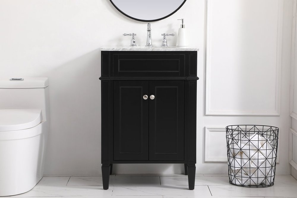 Modern sophistication is defined within the black finish and brushed nickel knobs of this compact vanity. Its modest length makes it the perfect addition to any sized home, and saves space with its storage area hidden behind the double cabinet doors. Topped with a Carrara white marble counter top and a porcelain sink, this design will add everlasting class to your bathroom and powder room.