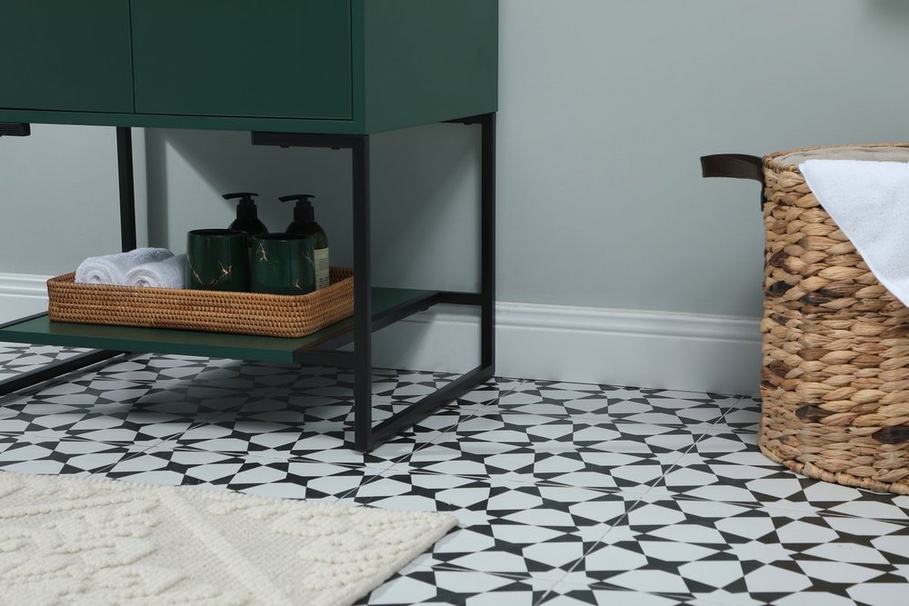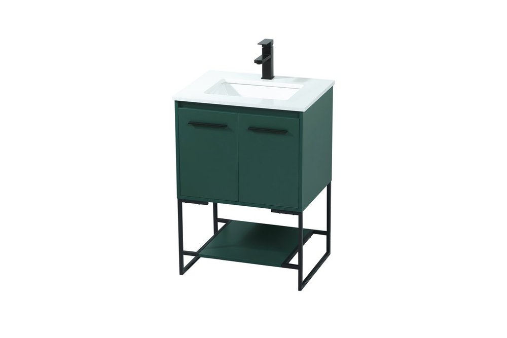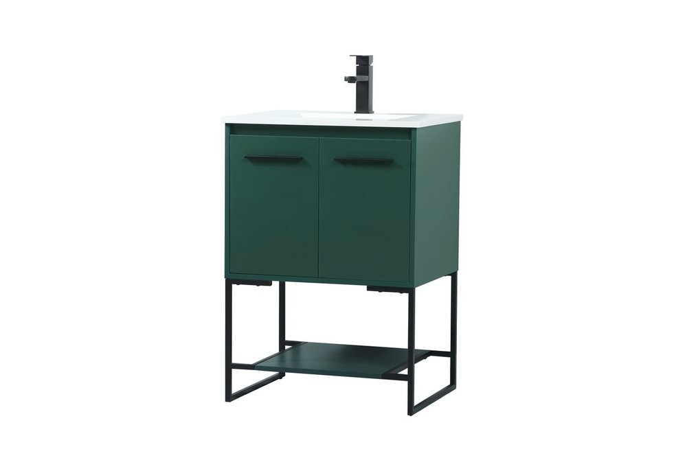 Live in modern comfort with this 24" green finish vanity. Dressed in a green and sleek black metal hardware, its contemporary style will have your bathroom or powder room elevated in industrial sophistication. The open shelf at the base and two doors reveal ample storage space for your bathroom essentials and miscellany. Clean lines create its own visual interest, adding trendy looks to your already chic room.
