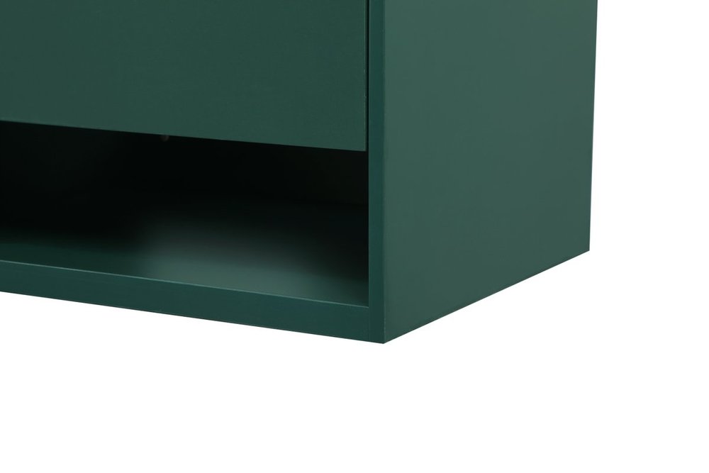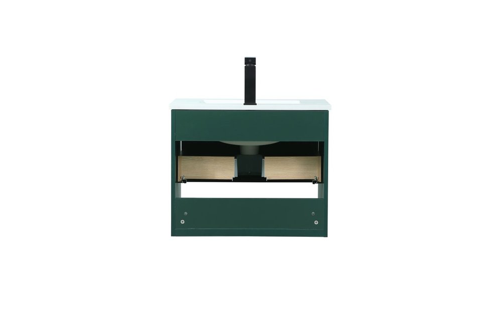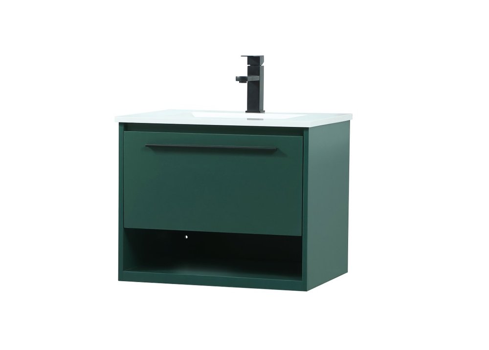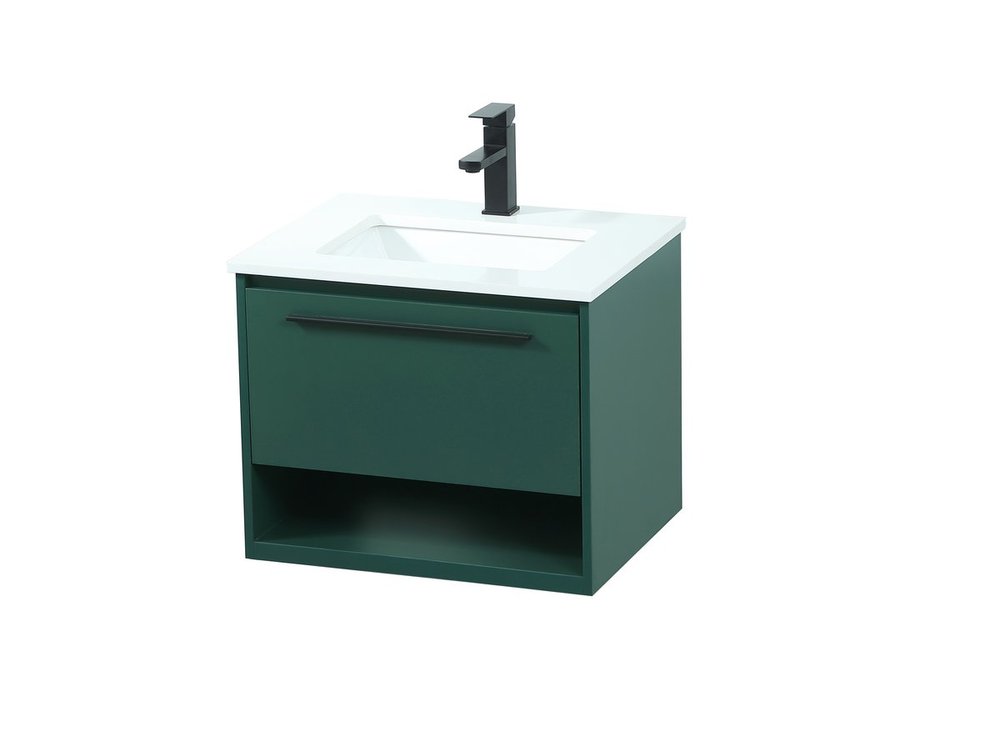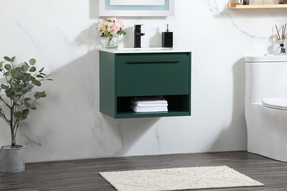 Save space and make your bathroom appear bigger with this floating vanity. Its minimal design will have you in awe, while its clean lines will leave your room feeling fresh and uncluttered. The Single u-drawer pulls out for storage while the open space below allows you to place extra towels or various other essentials. The ivory white engineered marble counter top with porcelain sink adds refined luxe while the aluminum barpull style handle adorn the vanity face.