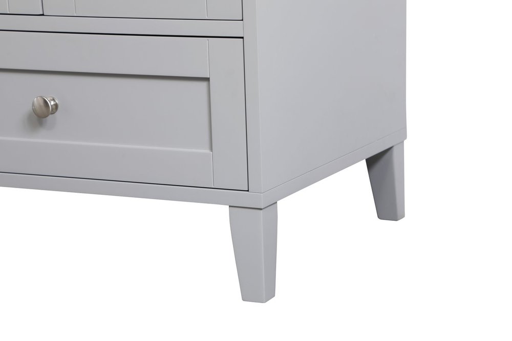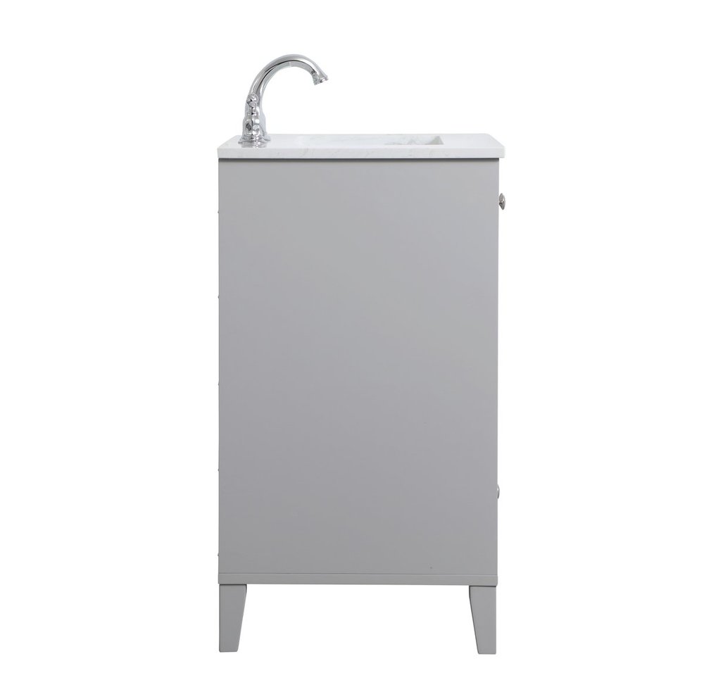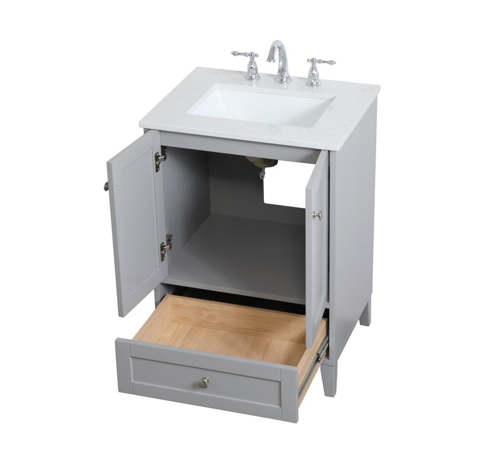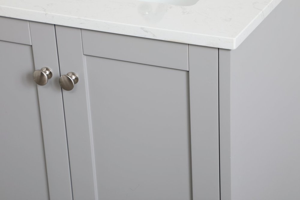 While unassuming, this 24" vanity in a grey finish sure knows how to redefine luxury. The sleek brushed nickel knobs adorn the two cabinet doors and base drawer which allows you to store your bathroom toiletries and necessities. Standing strong on oblique legs and dressed with a calacatta engineered marble countertop, this vanity will surely create beauty and casual elegance in your bathroom or powder room.