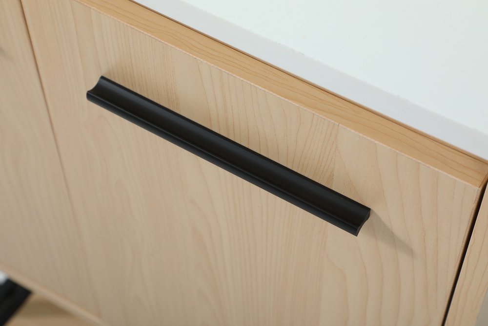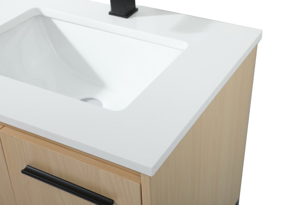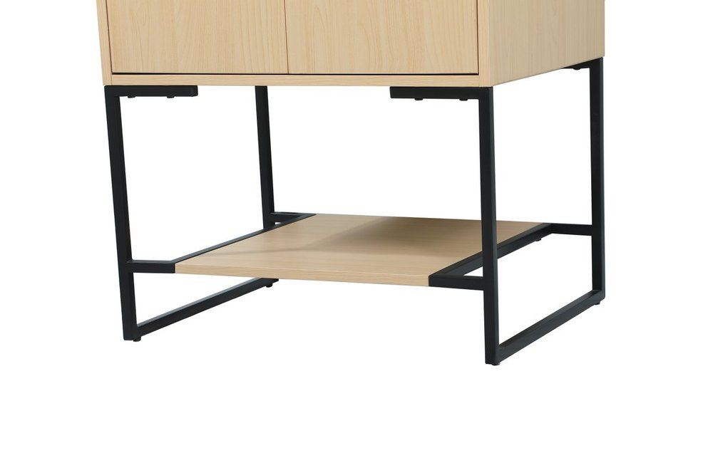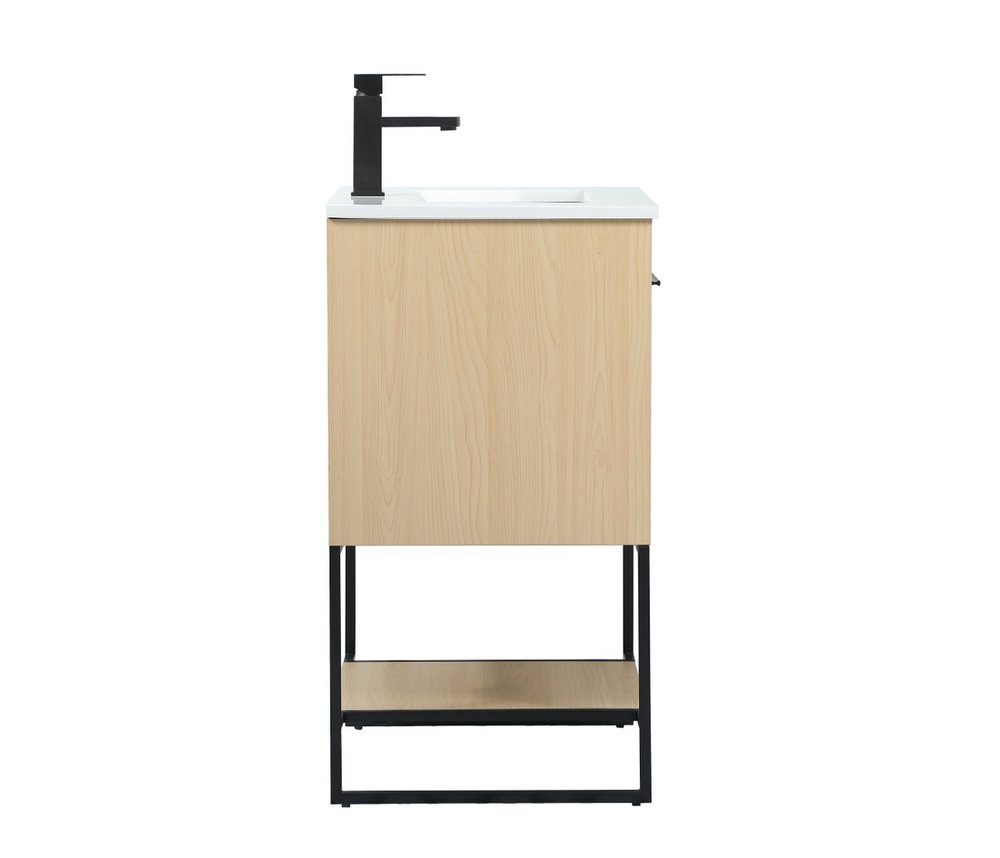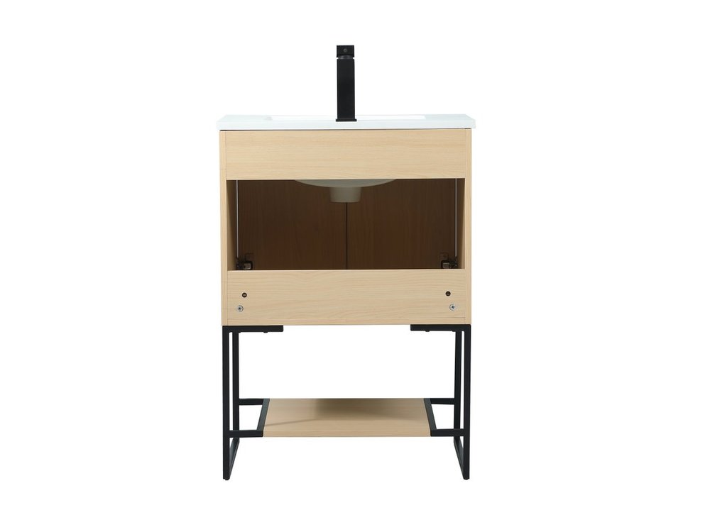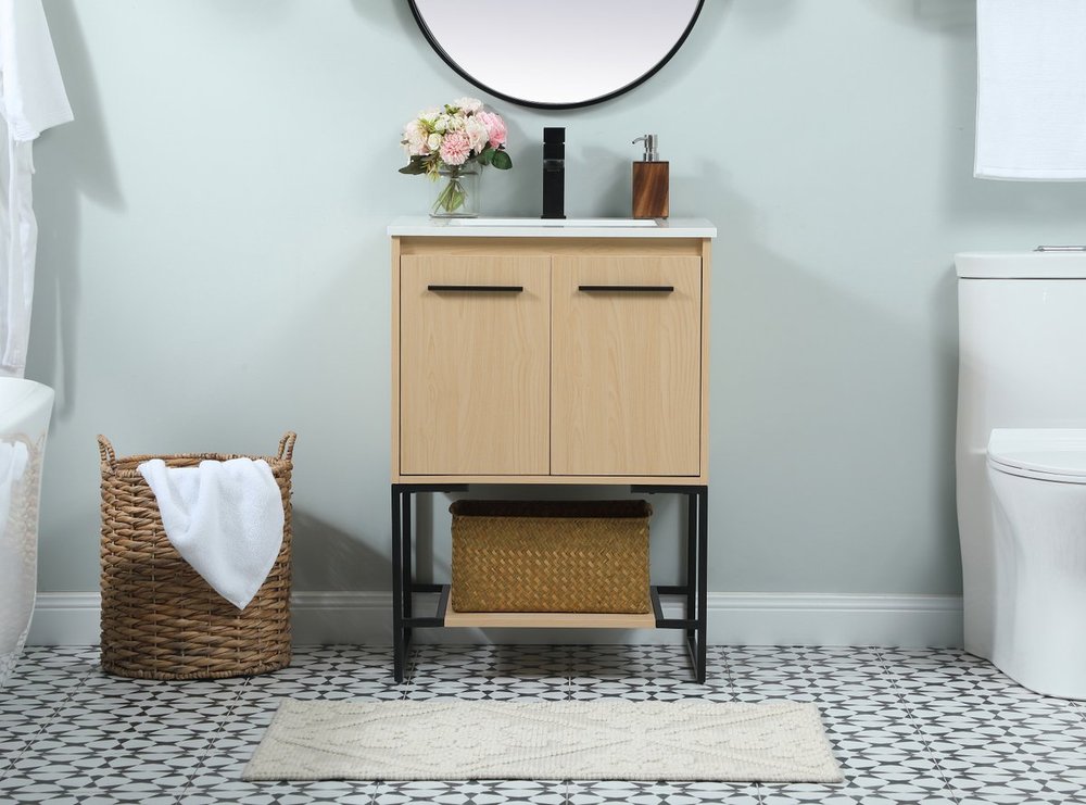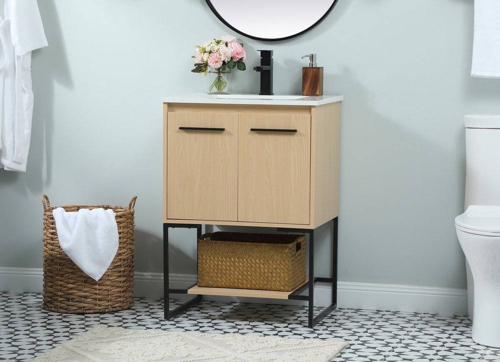Live in modern comfort with this 24" maple finish vanity. Dressed in a maple and sleek black metal hardware, its contemporary style will have your bathroom or powder room elevated in industrial sophistication. The open shelf at the base and two doors reveal ample storage space for your bathroom essentials and miscellany. Clean lines create its own visual interest, adding trendy looks to your already chic room.