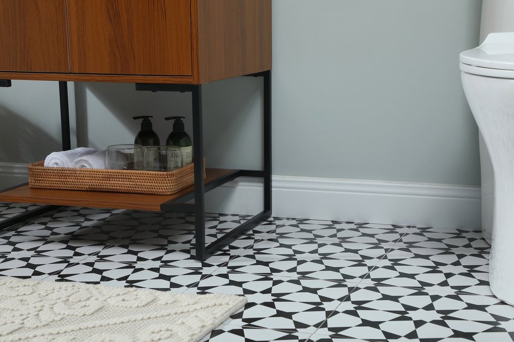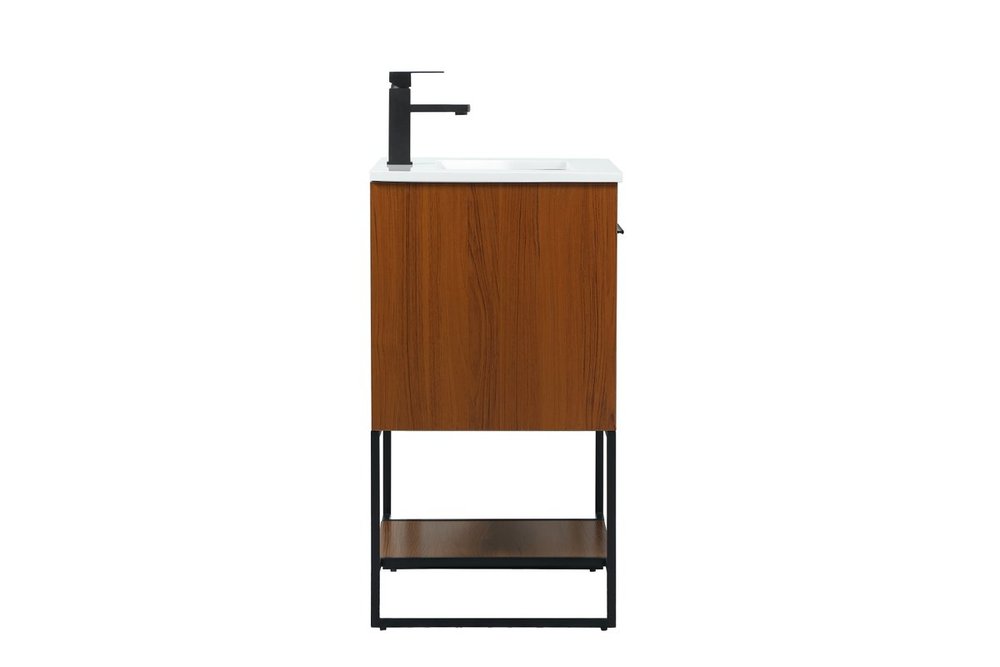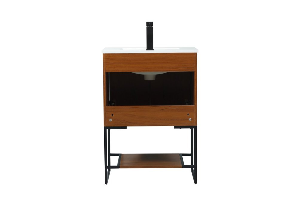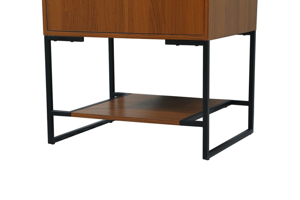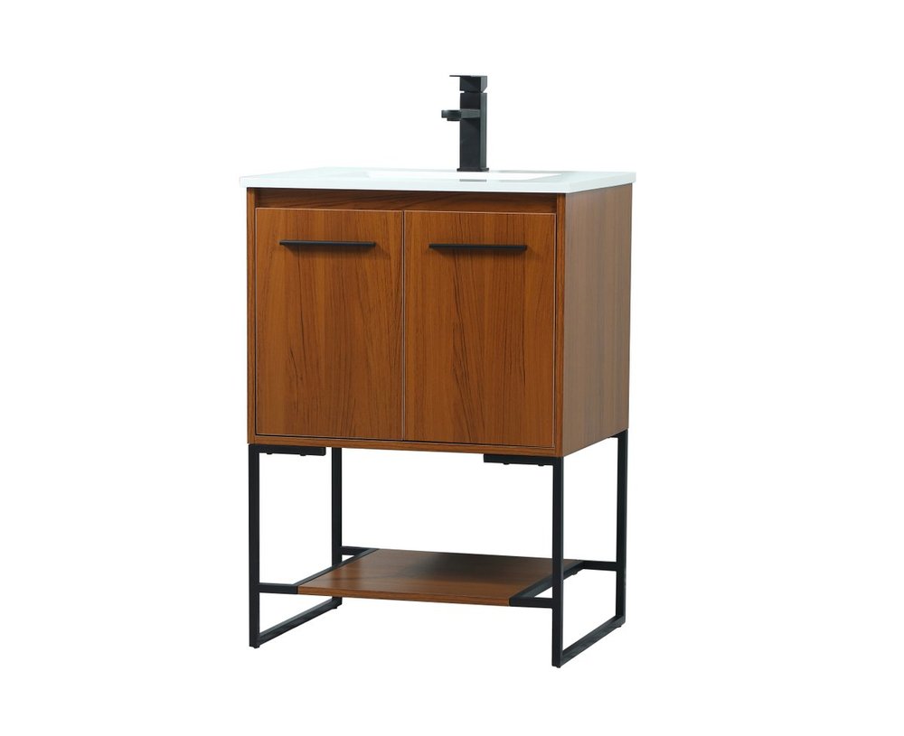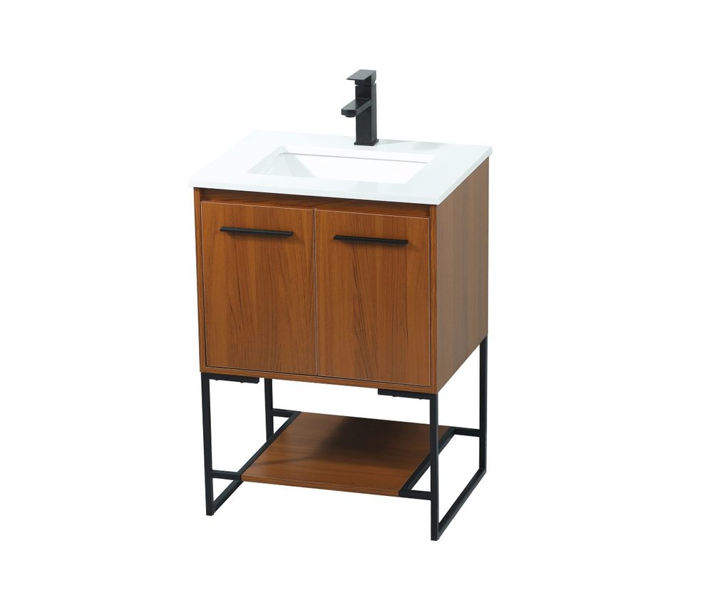 Live in modern comfort with this 24" teak finish vanity. Dressed in a teak and sleek black metal hardware, its contemporary style will have your bathroom or powder room elevated in industrial sophistication. The open shelf at the base and two doors reveal ample storage space for your bathroom essentials and miscellany. Clean lines create its own visual interest, adding trendy looks to your already chic room.