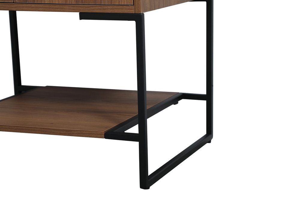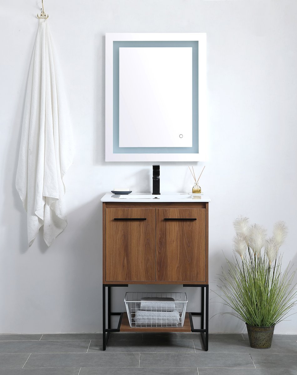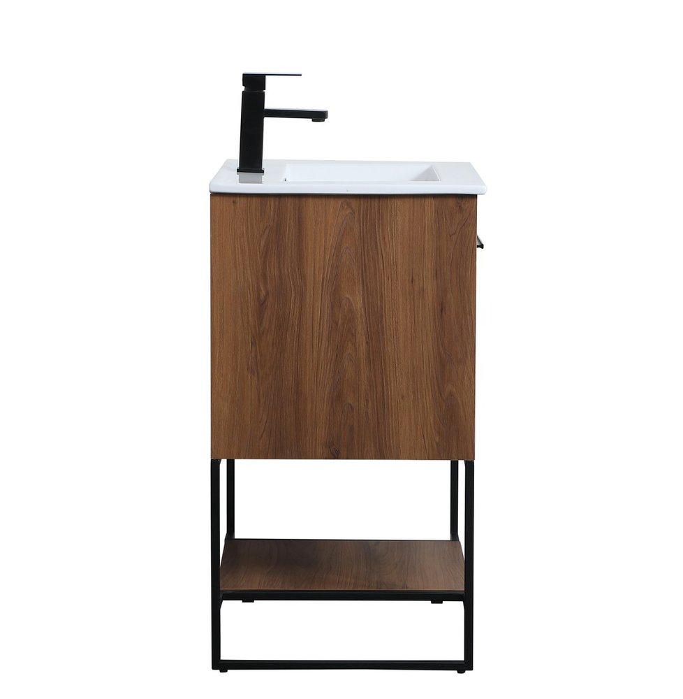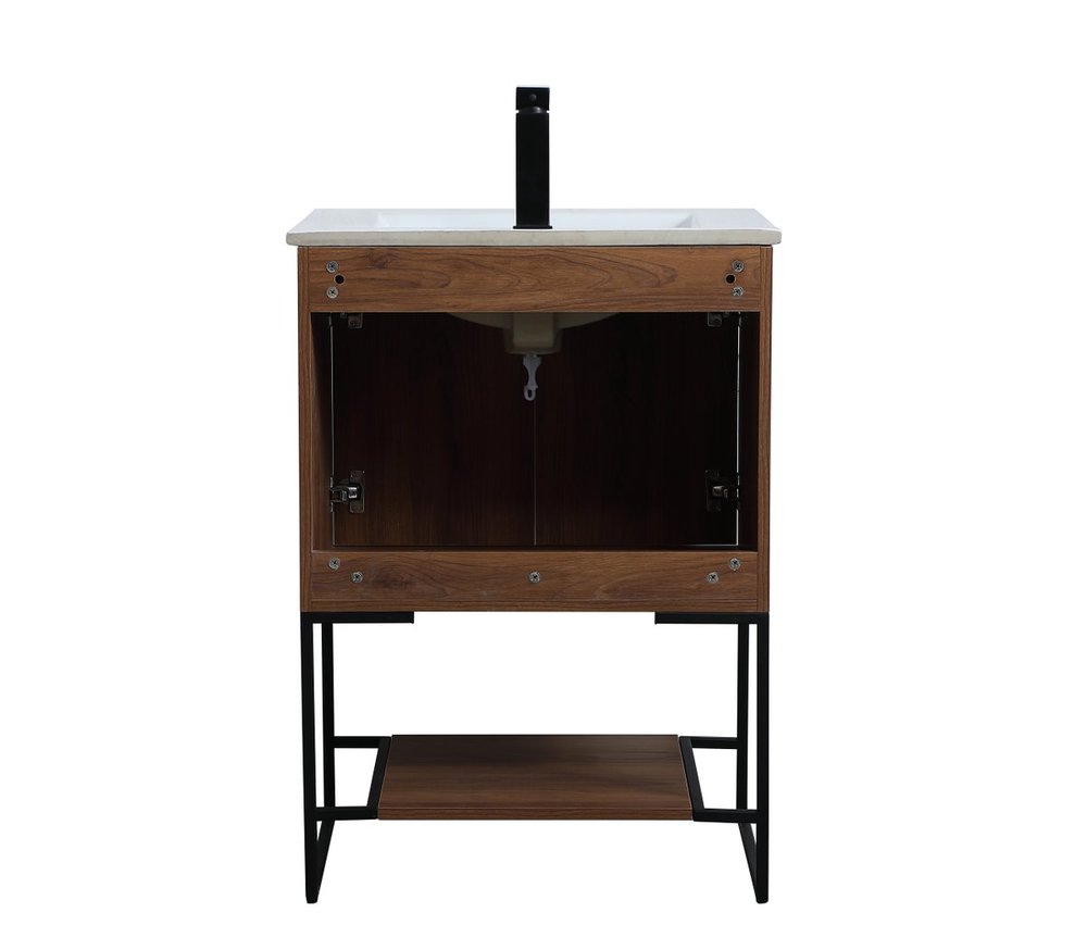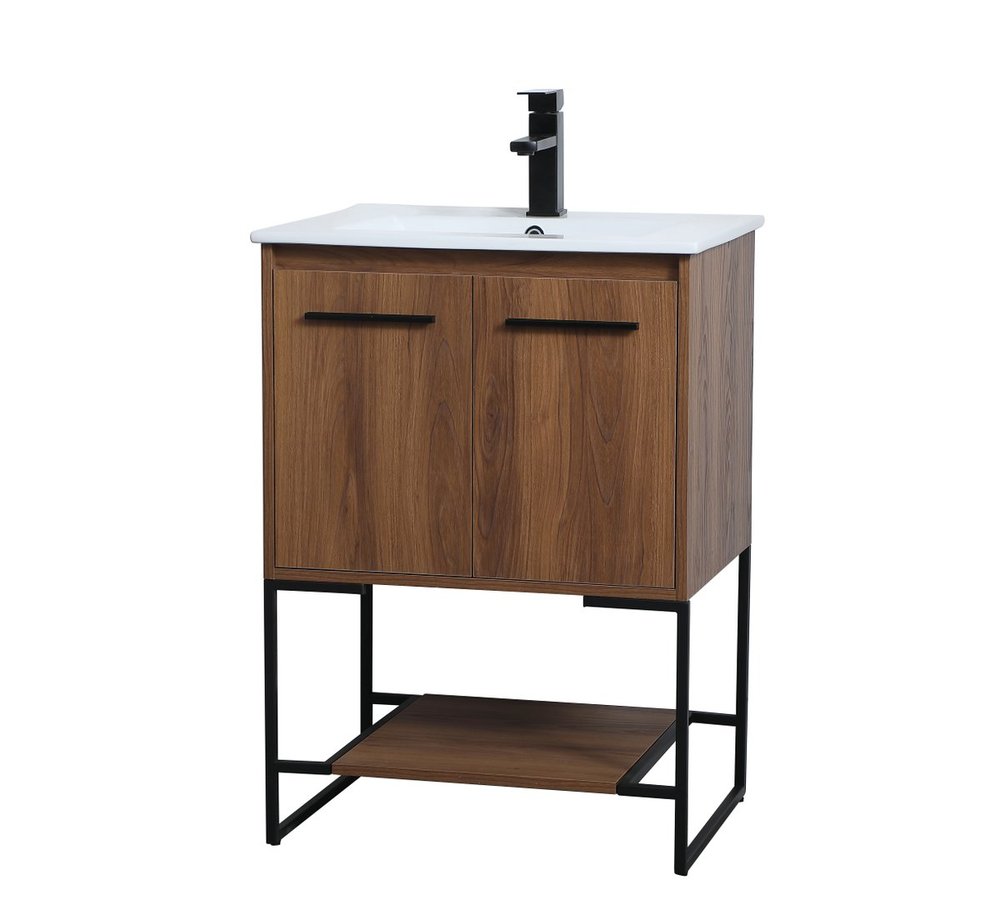 Live in modern comfort with this 24" walnut brown finish vanity. Dressed in a concrete grey and sleek black metal hardware, its contemporary style will have your bathroom or powder room elevated in industrial sophistication. The open shelf at the base and two doors reveal ample storage space for your bathroom essentials and miscellany. Clean lines create its own visual interest, adding trendy looks to your already chic room.