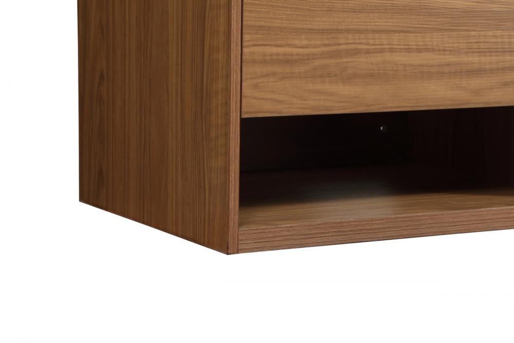 Save space and make your bathroom appear bigger with this floating vanity. Its minimal design will have you in awe, while its clean lines will leave your room feeling fresh and uncluttered. The Single u-drawer pulls out for storage while the open space below allows you to place extra towels or various other essentials. The ivory white engineered marble counter top with porcelain sink adds refined luxe while the aluminum barpull style handle adorn the vanity face.