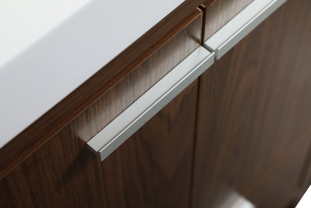 Modern sophistication is defined within the walnut finish and silver barpulls of this vanity. Its length makes it the perfect addition to any sized home, and saves space with its storage area hidden behind the double cabinet doors and one bottom drawers. Topped with a highly durable resin white counter top and an integrated sink, this modern design will add everlasting class to your bathroom and powder room.