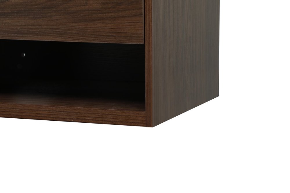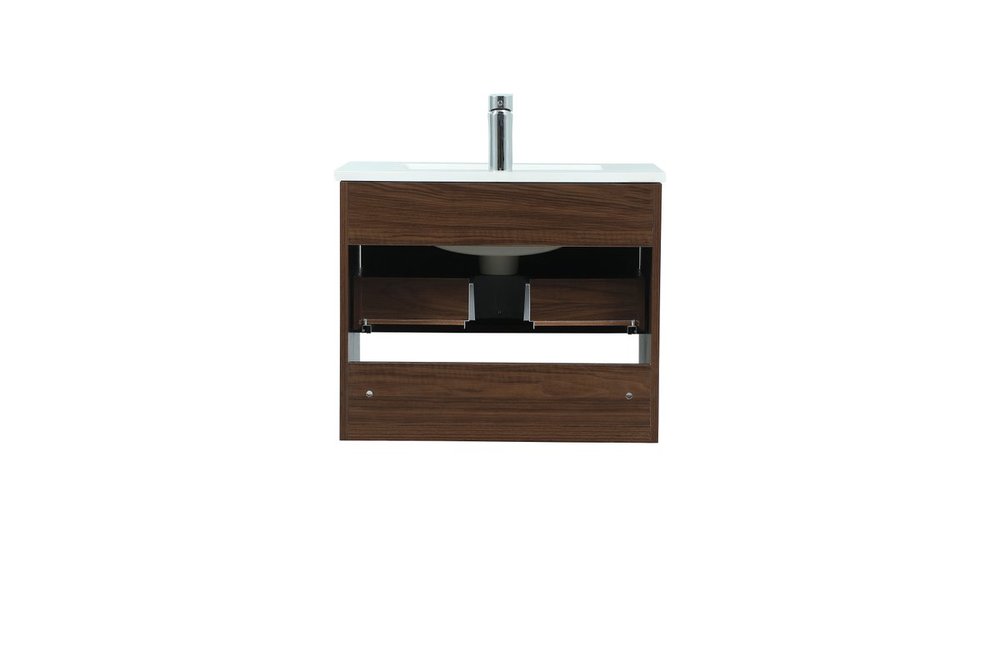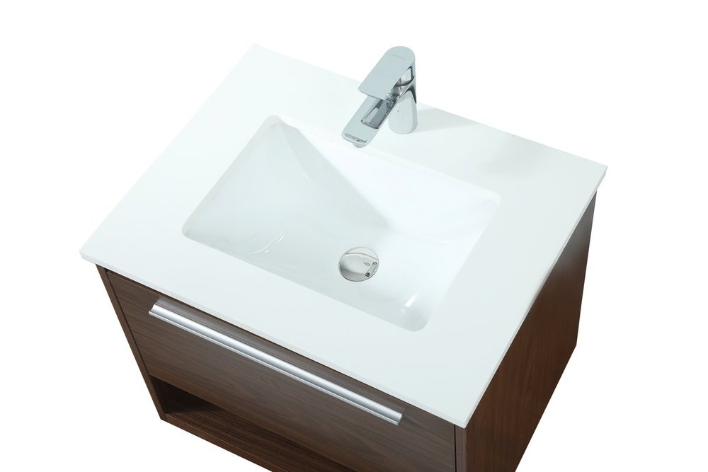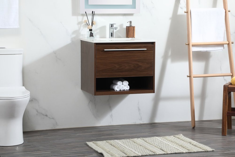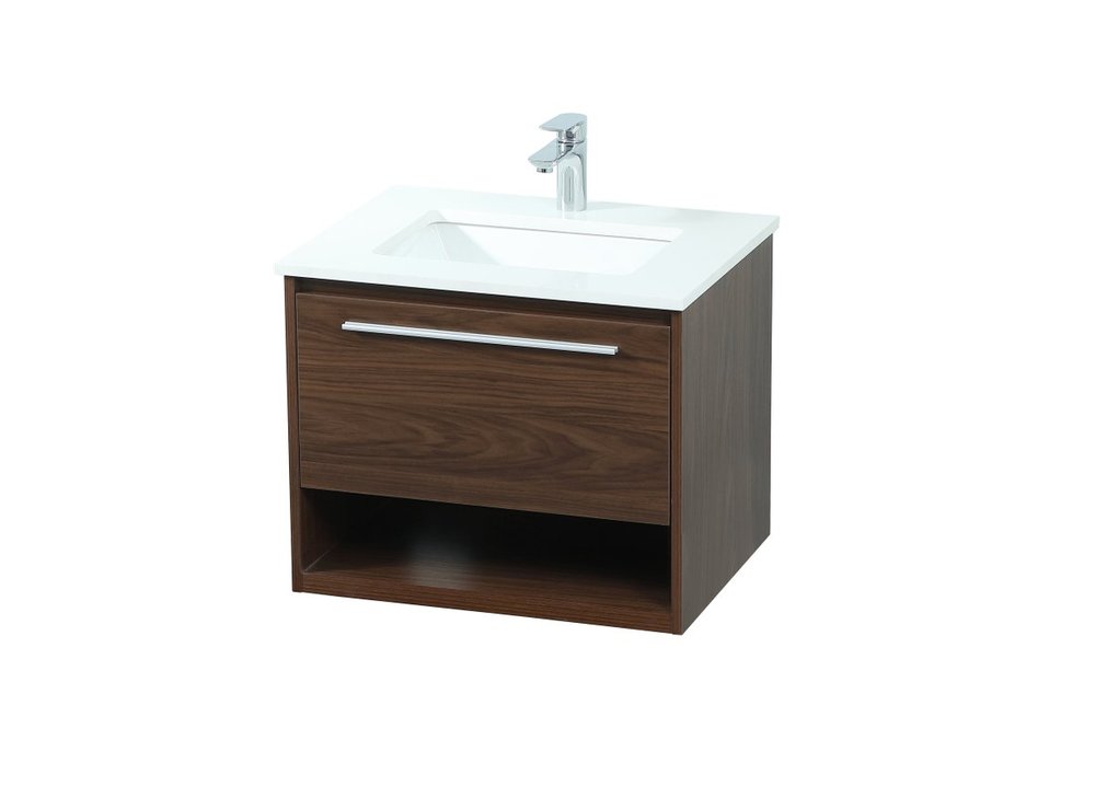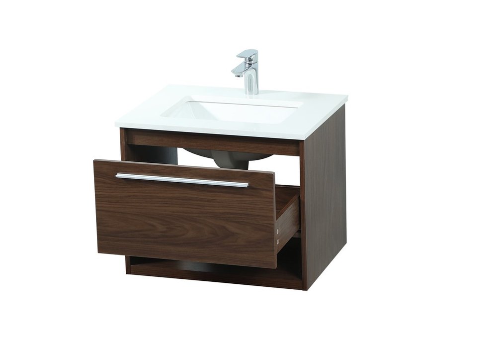 Save space and make your bathroom appear bigger with this floating vanity. Its minimal design will have you in awe, while its clean lines will leave your room feeling fresh and uncluttered. The Single u-drawer pulls out for storage while the open space below allows you to place extra towels or various other essentials. The ivory white engineered marble counter top with porcelain sink adds refined luxe while the aluminum barpull style handle adorn the vanity face.