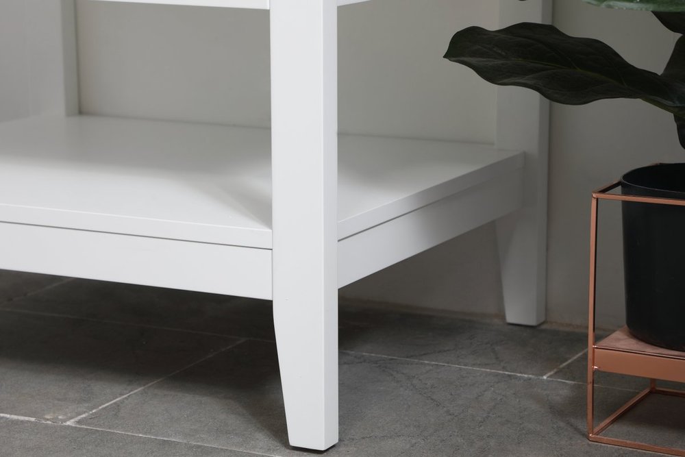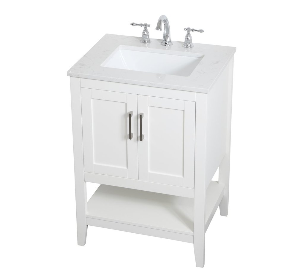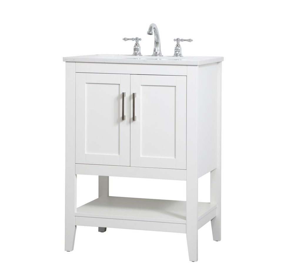 The nonchalant attitude of this 24" traditional white finish vanity will have you wanting more. The slender brushed nickel handle bars open the two cabinet doors to reveal ample storage space to put away and store bathroom essentials, and the open space below allows for you to place clean towels on the rack. Topped with a calacatta engineered marble countertop, you and your guests will enjoy this easy going vanity.