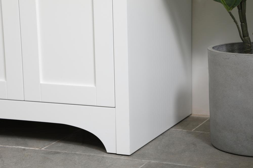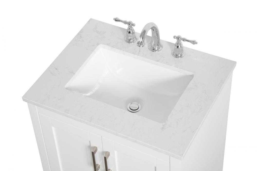 The refined simplicity of this 24" white finish vanity creates a peaceful, yet stylish, atmosphere. Its traditional modernity adds a mature beauty that will elevate any bathroom or powder room--the Calacatta engineered marble counter top adds refined luxe while the brushed nickel handle bars open the two cabinet doors, revealing ample storage space to store and hide away an assortment of bathroom essentials. Whether your home is large or small, this vanity will surely fit in well.