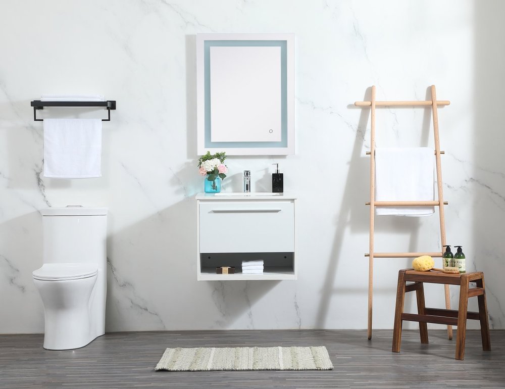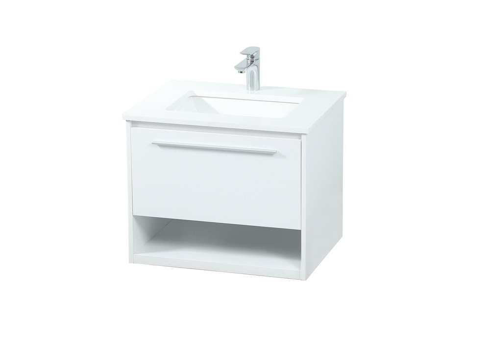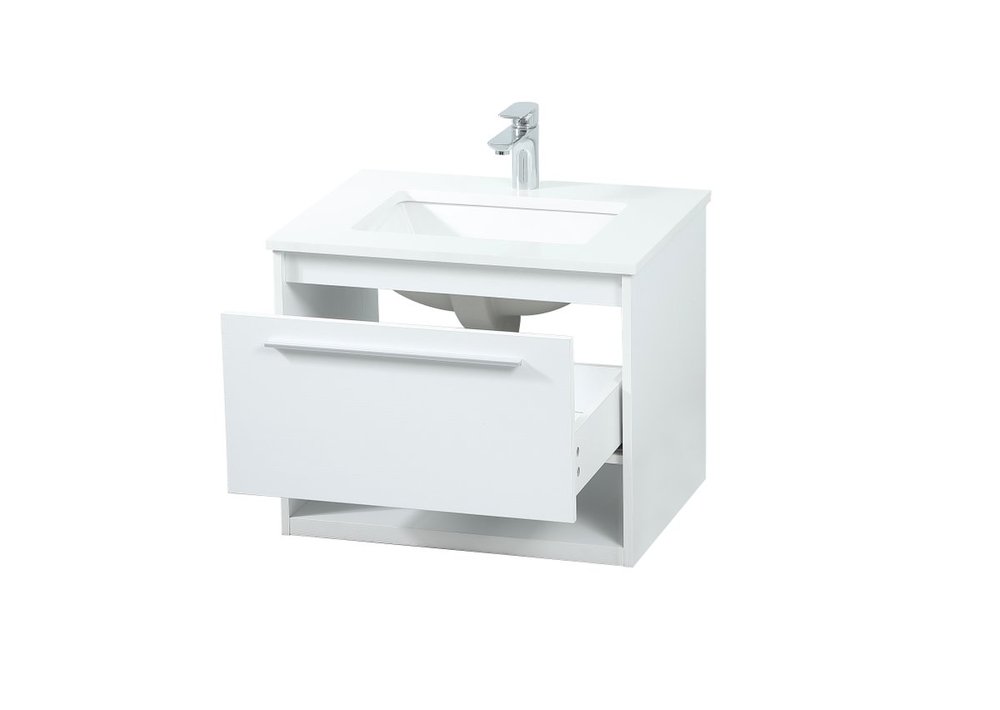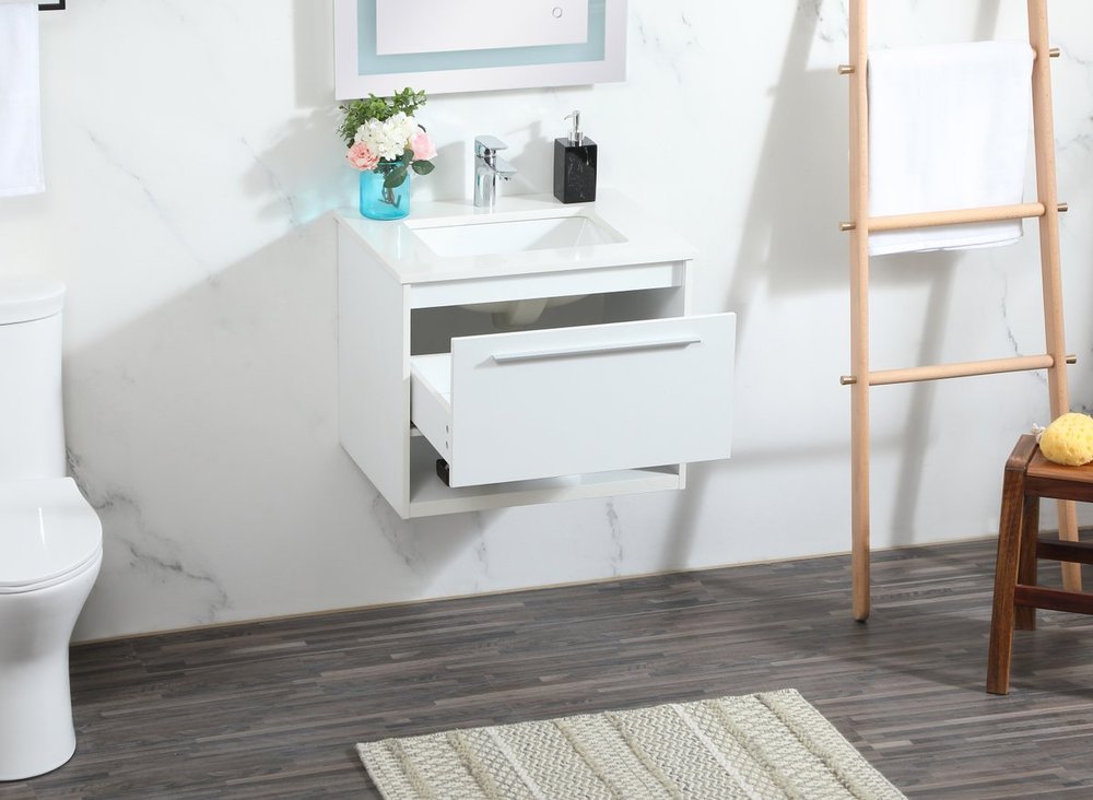 Save space and make your bathroom appear bigger with this floating vanity. Its minimal design will have you in awe, while its clean lines will leave your room feeling fresh and uncluttered. The Single u-drawer pulls out for storage while the open space below allows you to place extra towels or various other essentials. The ivory white engineered marble counter top with porcelain sink adds refined luxe while the aluminum barpull style handle adorn the vanity face.