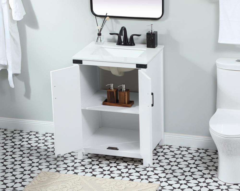 Reminiscent of barn doors, the 2 door cabinet adds both stylistic charm and function with its plethora of storage options for all your bathroom essentials. Whether for your bathroom or the guests', everyone will marvel at its classic look for traditional and farmhouse aesthetics. A slab of engineered marble rounds out the piece up top, as well as the porcelain under mount sink and predrilled faucet holes. This vanity arrives fully assembled.