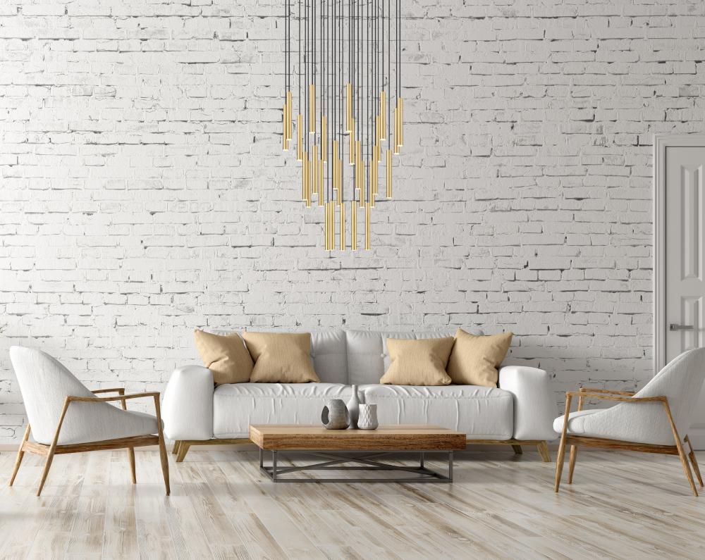 Enjoy the rich depth and sophistication of the modern gold finish on this modern 27-light LED chandelier. Dimmable, its a distinctive design with staggered lights within slim housings that create a pinpoint effect thats sure to captivate. The verticality of the fixture is ideal for high ceilings and staircases, creating a refined focal point that centers the surrounding decor.