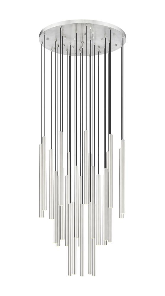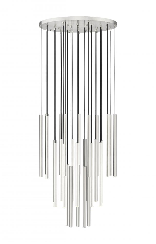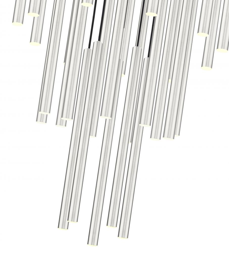 Slim cylindrical housings create a compelling silhouette as theyre tightly clustered on this modern 27-light chandelier. Casting bright, bold illumination, it features integrated LED lights that are dimmable and energy efficient, ideal for a graceful, contemporary entry or dining room. A brushed nickel finish lends a sleek style to any setting.