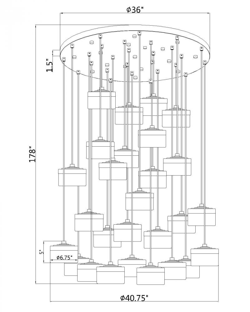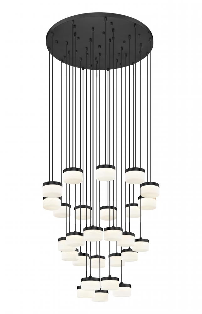 From a broad round canopy high above, this matte black 27-light LED chandelier releases slender cables to a cascade of clouded glass disks that seem to hover in space. The layered heights and generous lumen output suit double-height foyers and stairwells where you want impressive sparkle along with reliable illumination. Viewed from below or from an upper landing, the composition feels dynamic and refined, turning an everyday circulation space into a place people stop to look up.