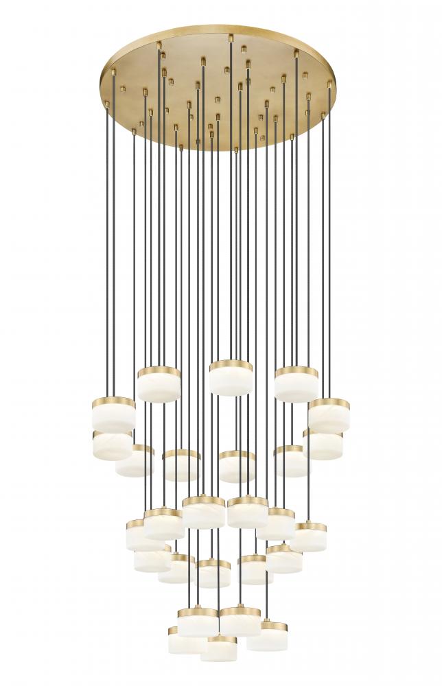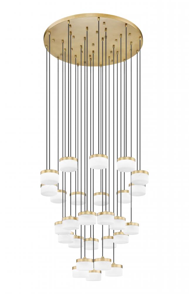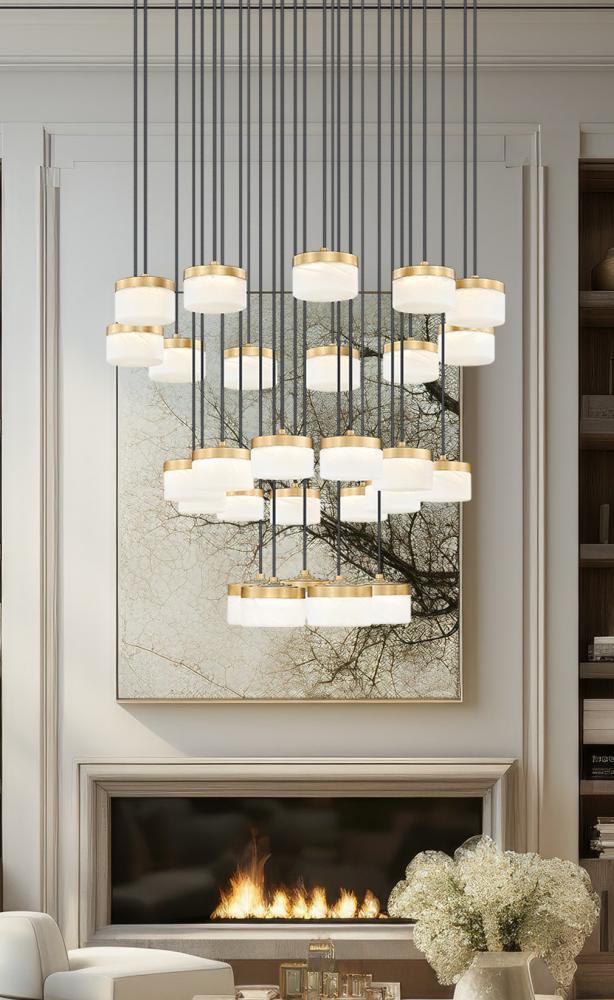 Glimmering in brushed metal, this modern gold 27-light LED chandelier drops a constellation of frosted cloud shades that fill tall rooms with a soft, radiant presence. The generous scale and adjustable cords make it easy to tailor the arrangement for grand entries, stair halls, or great rooms so each level of the home feels connected by light. As it shifts from bright daytime clarity to a mellow evening setting, it becomes a luminous centerpiece that signals arrival, welcome, and celebration.