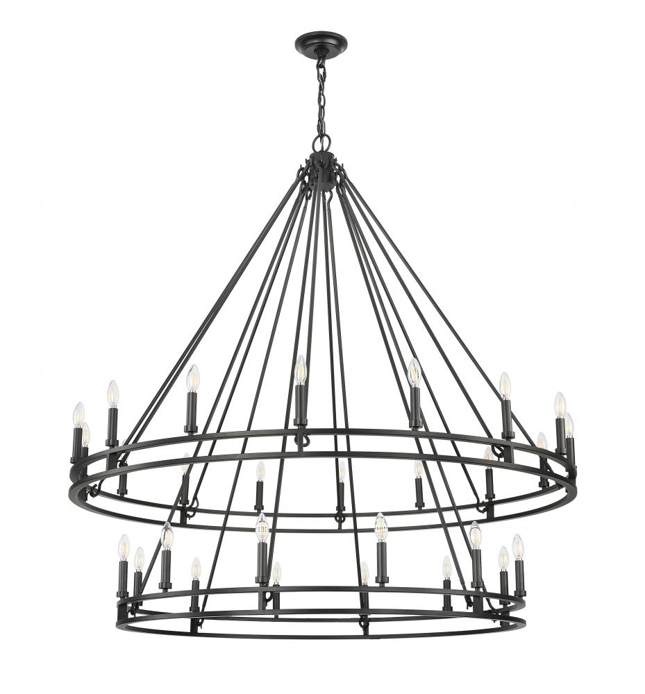 Go bold and eye-catching with this modern 28-light chandelier with a two-tiered silhouette. The inverted dimensions of the fixture, with a larger ring above a smaller ring, creates a dynamic look, perfect for high ceilings or over a grand staircase. Matte black is a perfect complement to the clean simplicity of the chandelier, while candelabra lights offer a touch of delicacy.