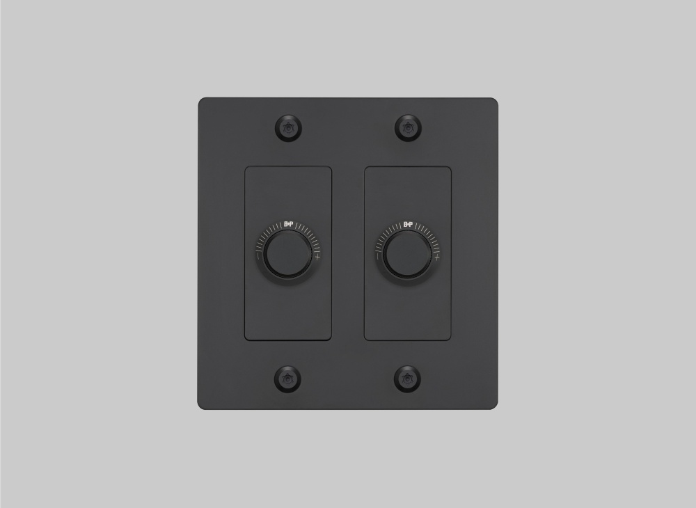A dimmer switch finished in black. The dimmer knob features our signature, linear knurl pattern and is made from solid black metal. FYI: This piece has a 4 mm shadow gap when installed.