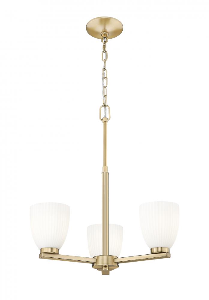 Wrapped in a modern gold finish, this three-light chandelier brings warmth and subtle radiance to overhead lighting. Matte opal glass with gentle ribbing softens each beam, creating a layered, elegant glow. It?s a refined statement piece that floats beautifully in kitchens, dining rooms, or entryways.