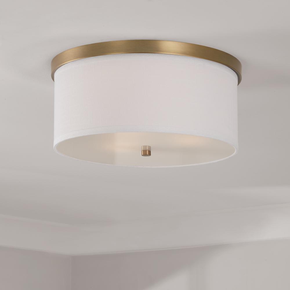 DETAILS: Aged Brass accents support a simple fabric shade and soft white diffuser.